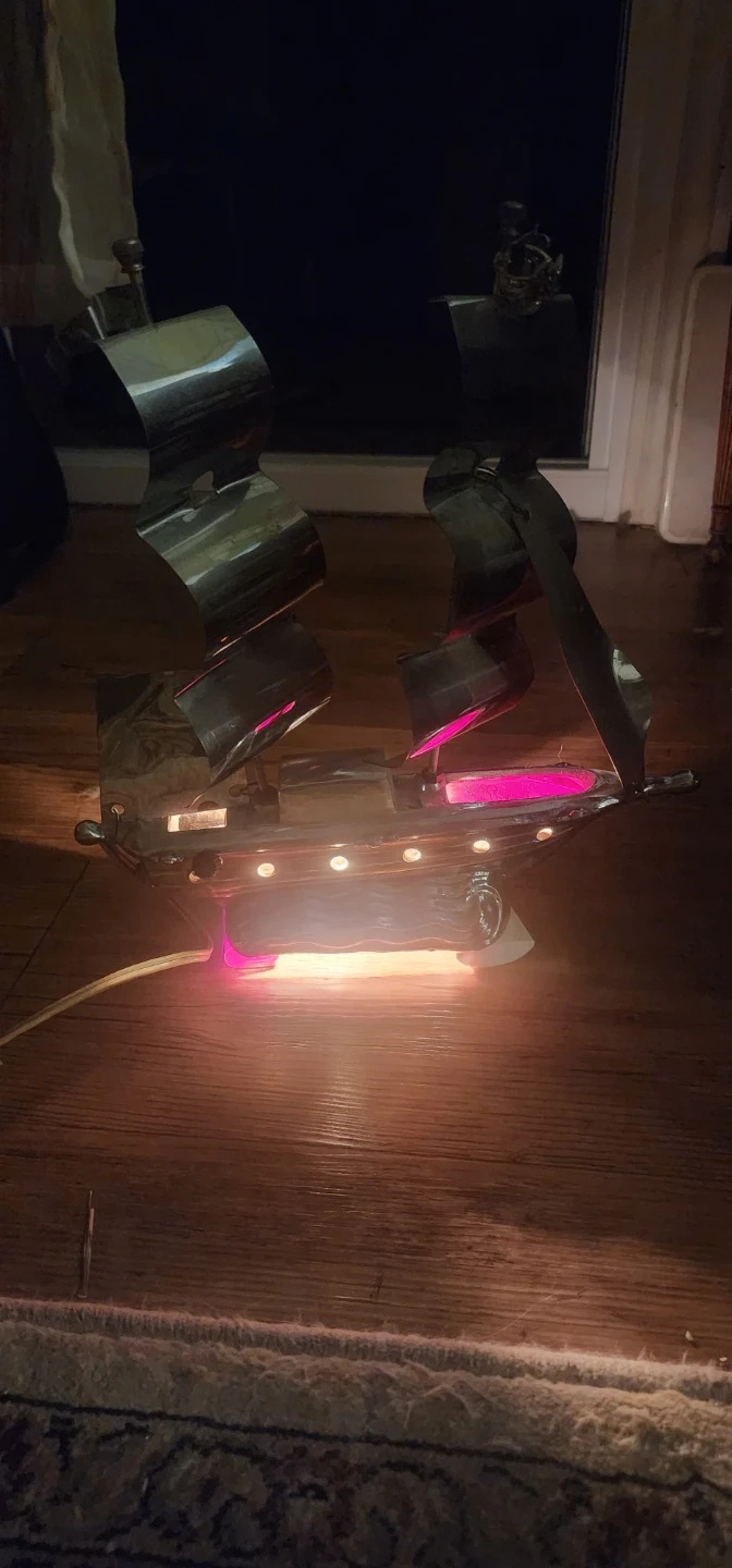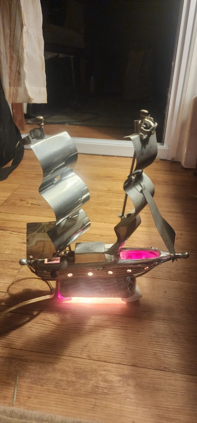 Here's a unique vintage metal ship lamp, perfect for adding a nautical touch to any room! It features a detailed ship design with metal sails and a warm, ambient light. A great conversation piece for your home or office