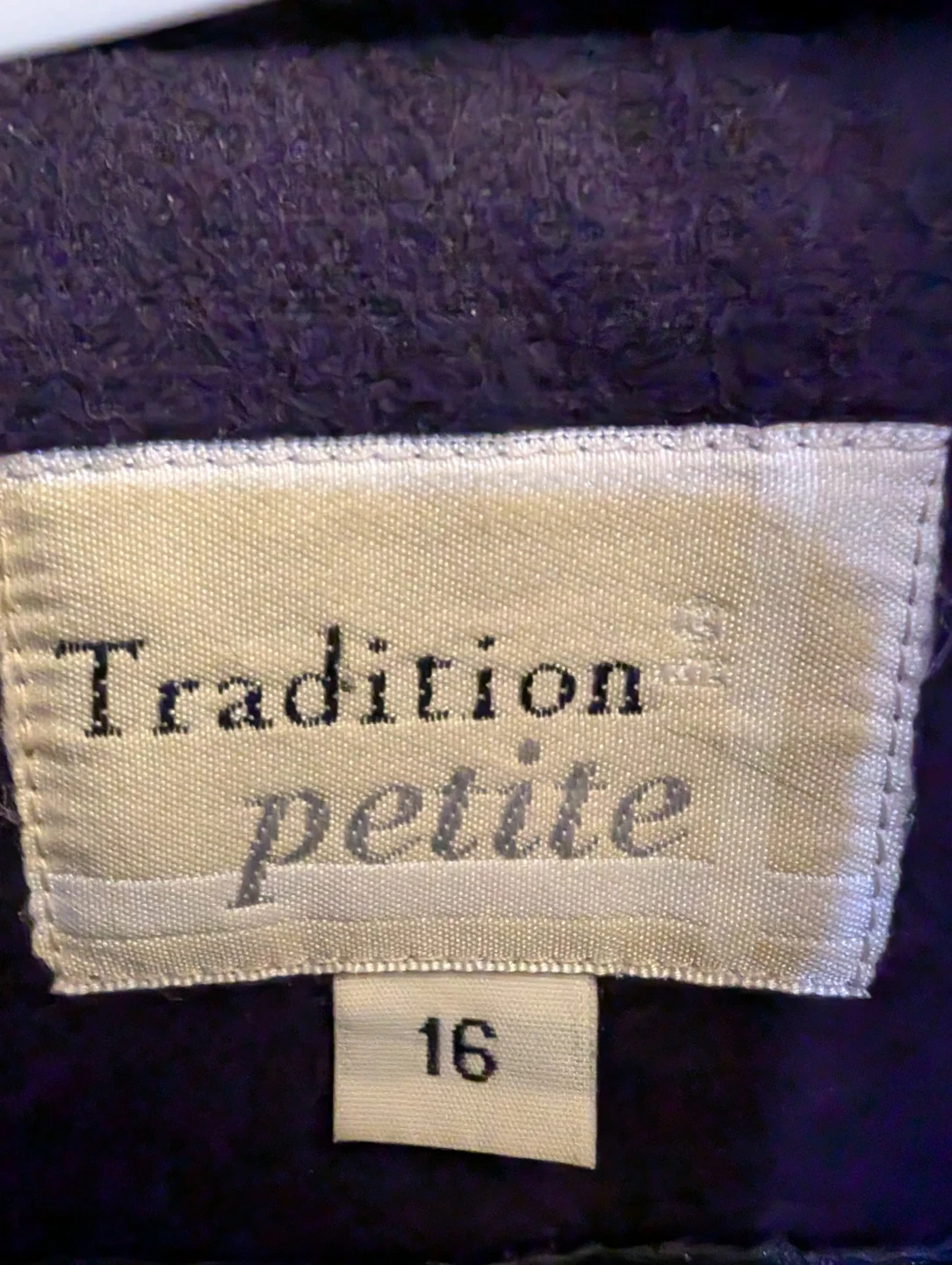 This is a Tradition Petite jacket in a size 16. It's a dark purple colour and features a button-up front. The jacket has a classic collar and two front pockets.