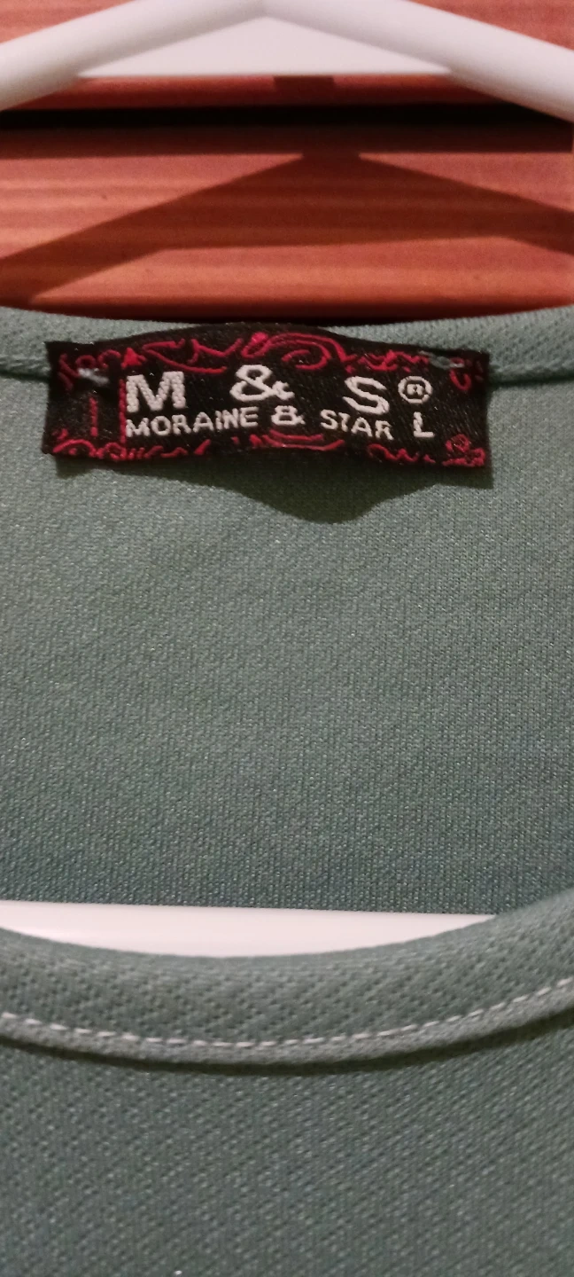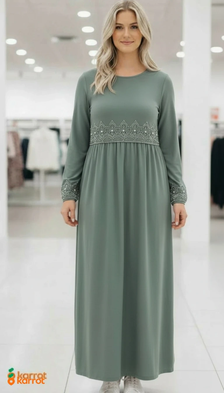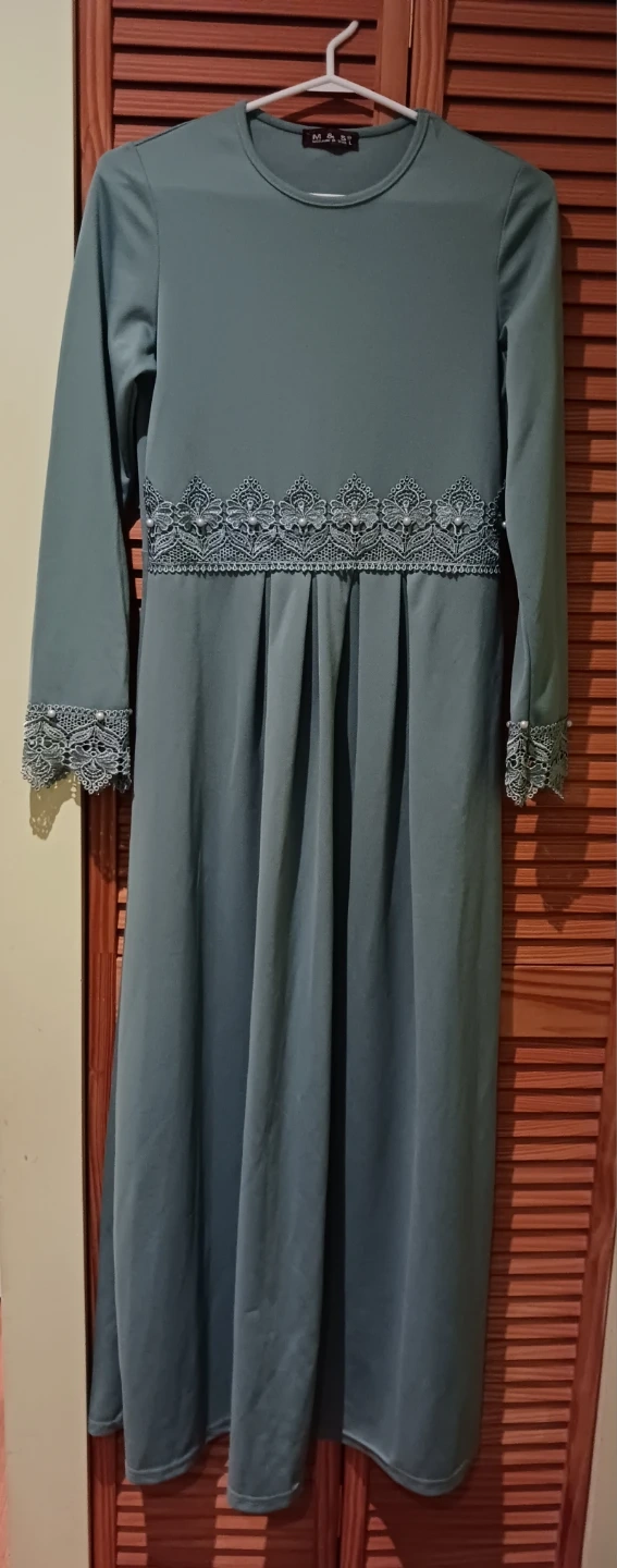 This Morraine & Star dress features long sleeves and a decorative beaded waistband. It's a size Large with a flattering pleated skirt. The sleeves and neckline have elegant beadwork.