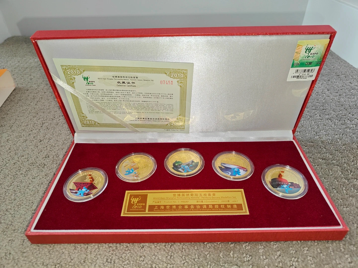 I am selling a Complete and Rare 2010 Shanghai World Expo Participating Nations' Pavilions Quinary Medallion Set with Certification Of Authenticity in new condition. Elevate your collection with this prestigious 2010 Shanghai World Expo Participating Nations' Pavilions Quinary Medallion Set. This officially licensed commemorative set (Product Code: P06257) was released in limited quantities to celebrate the "Better City, Better Life" global event.