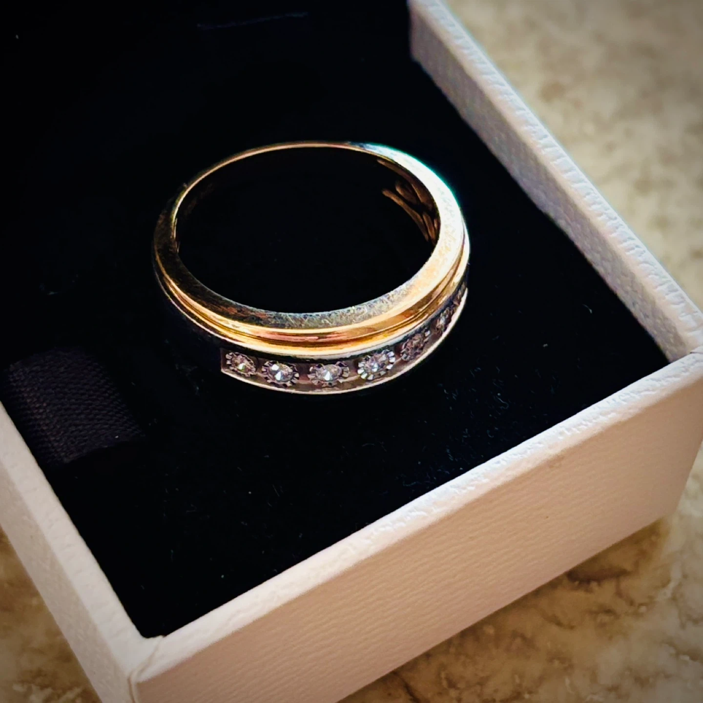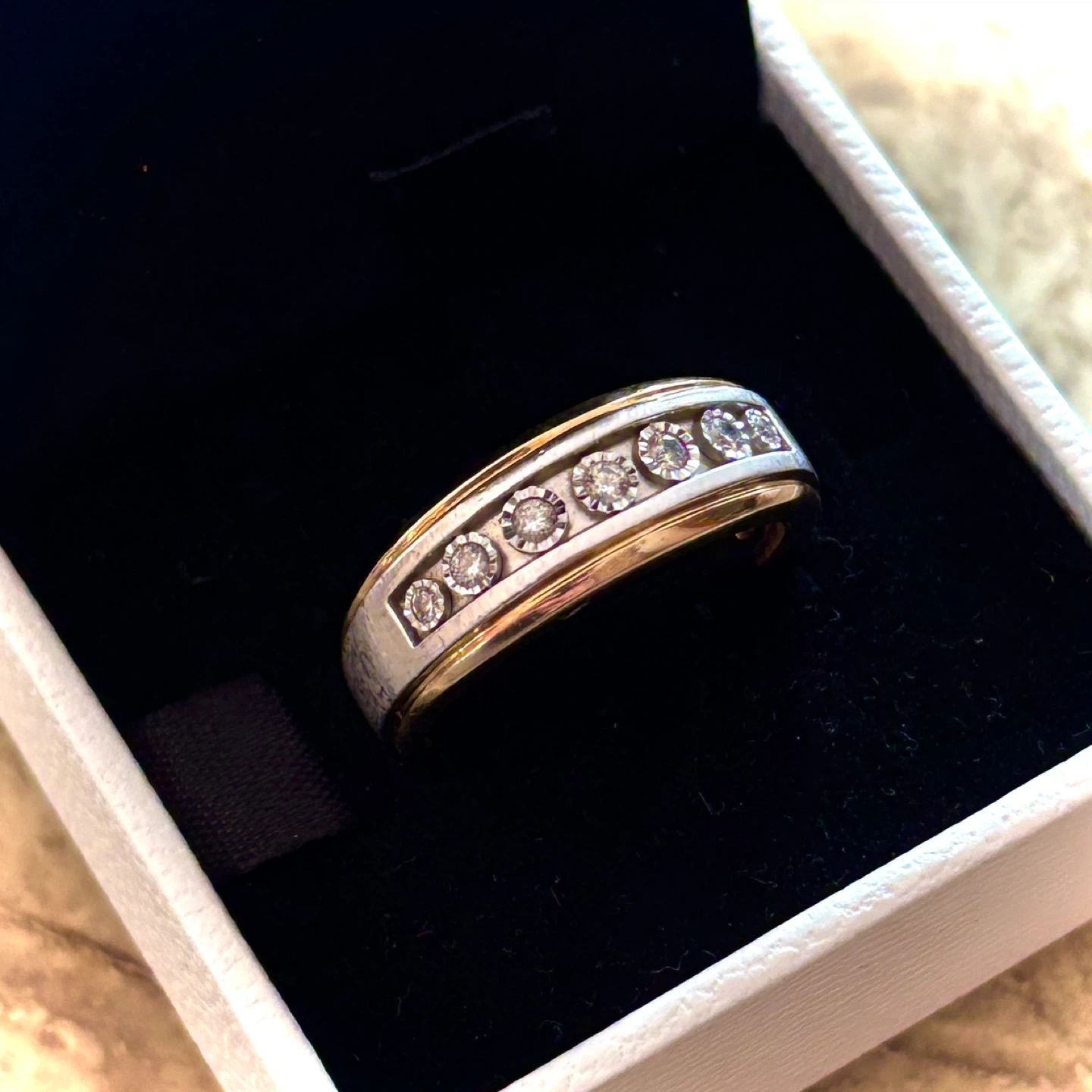 Stunning 10K yellow and white gold ring / wedding band, set in a strong masculine frame, with a row of 7 bright diamonds. Weighs over 6g and is hallmarked. Size 10.