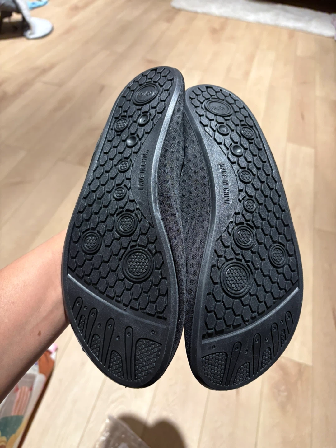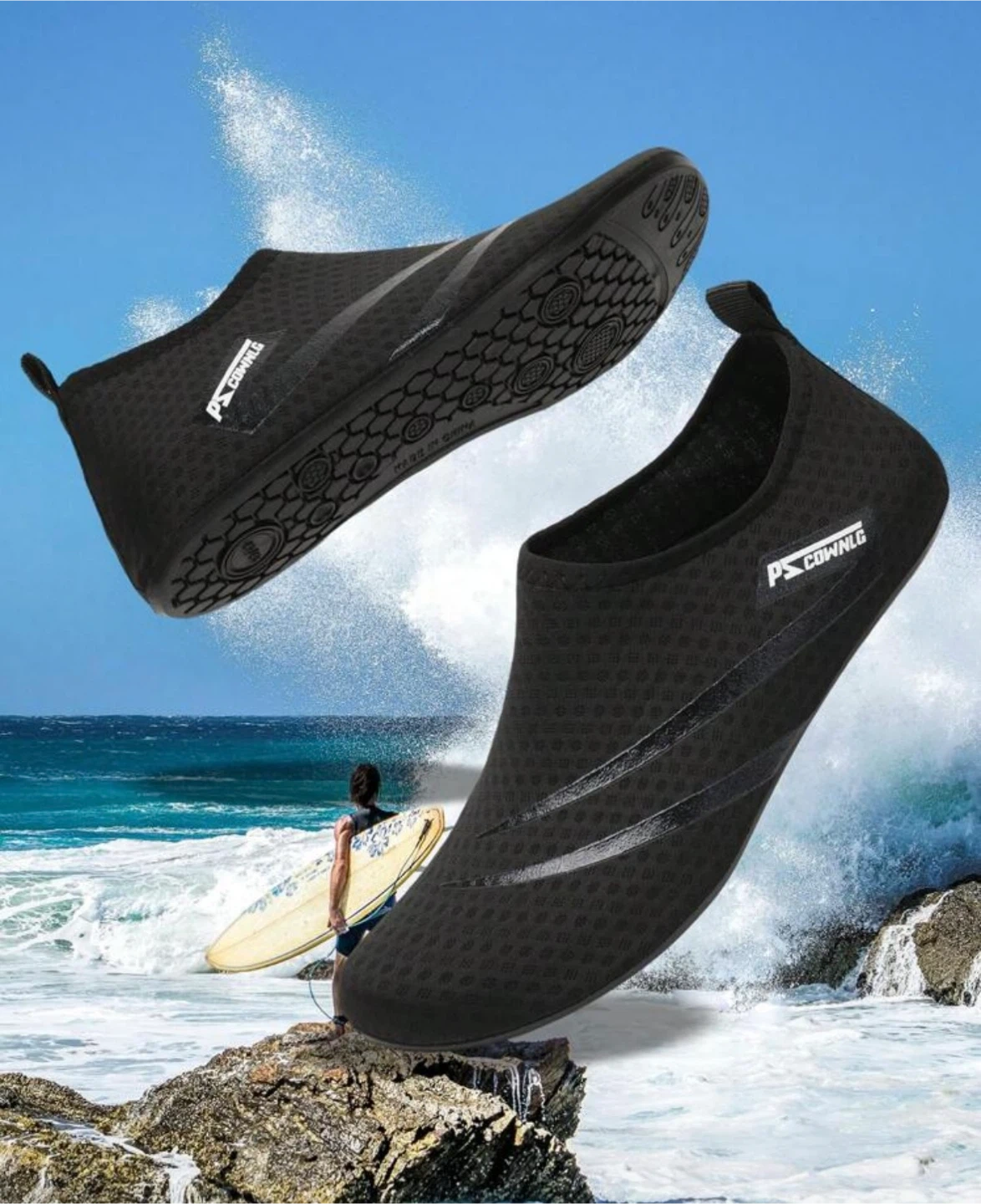 These black water shoes are from the brand PS COWNLG. They feature a quick-drying mesh upper and a grippy rubber sole for traction. They're lightweight and perfect for beach or water activities.
