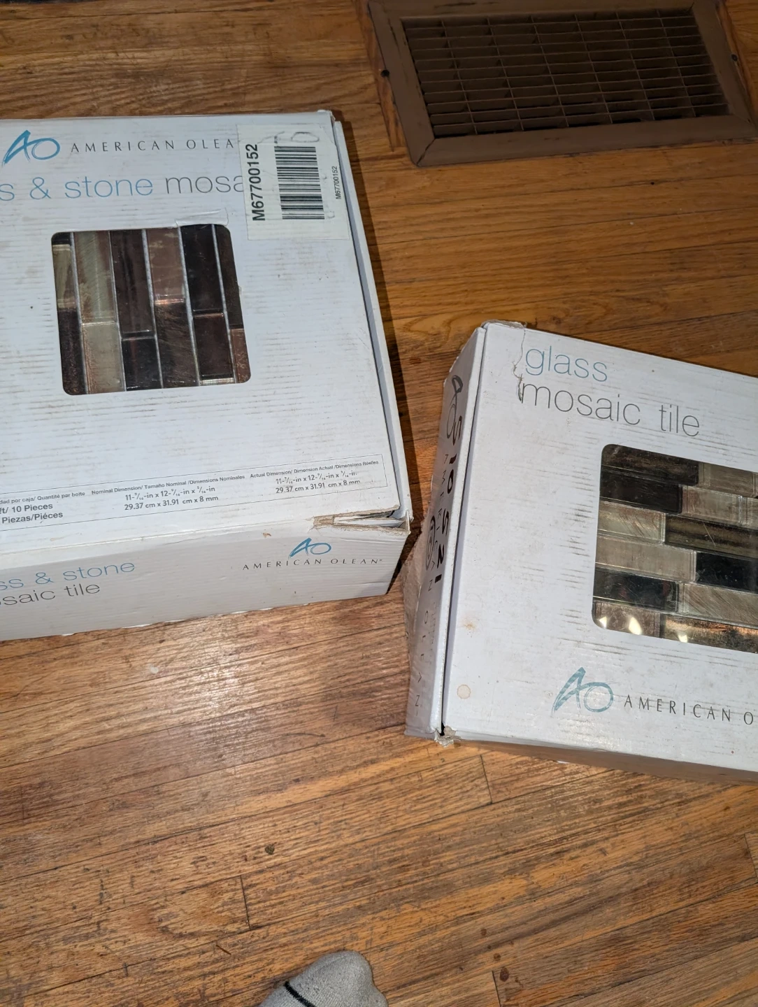 Two boxes of glass and stone mosaic tile. Each box covers 9.7 sq ft. Nominal dimensions are 11.5 x 12.5 inches.