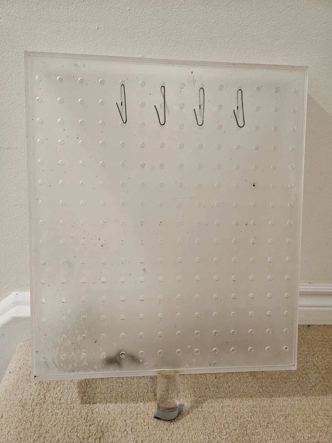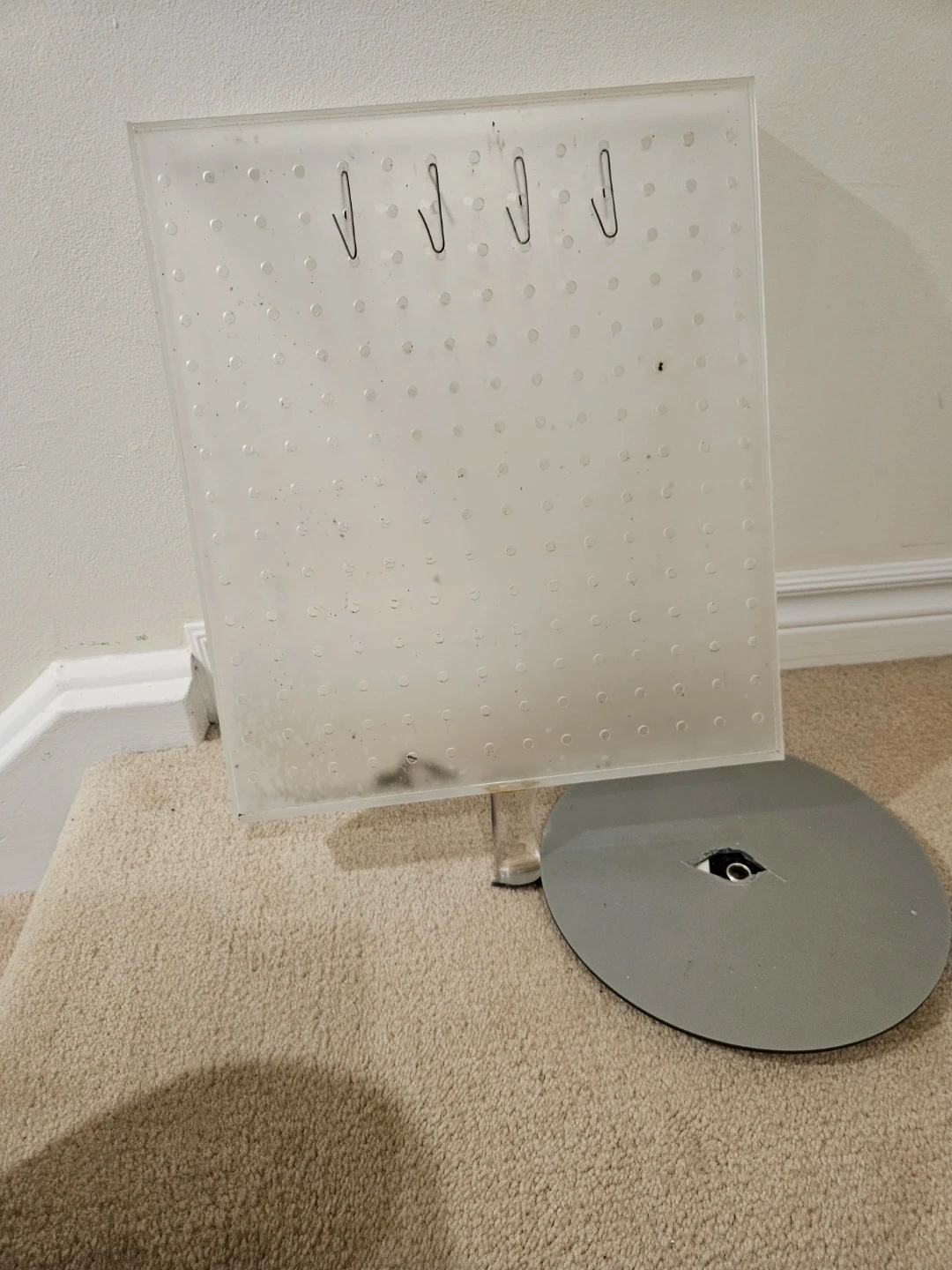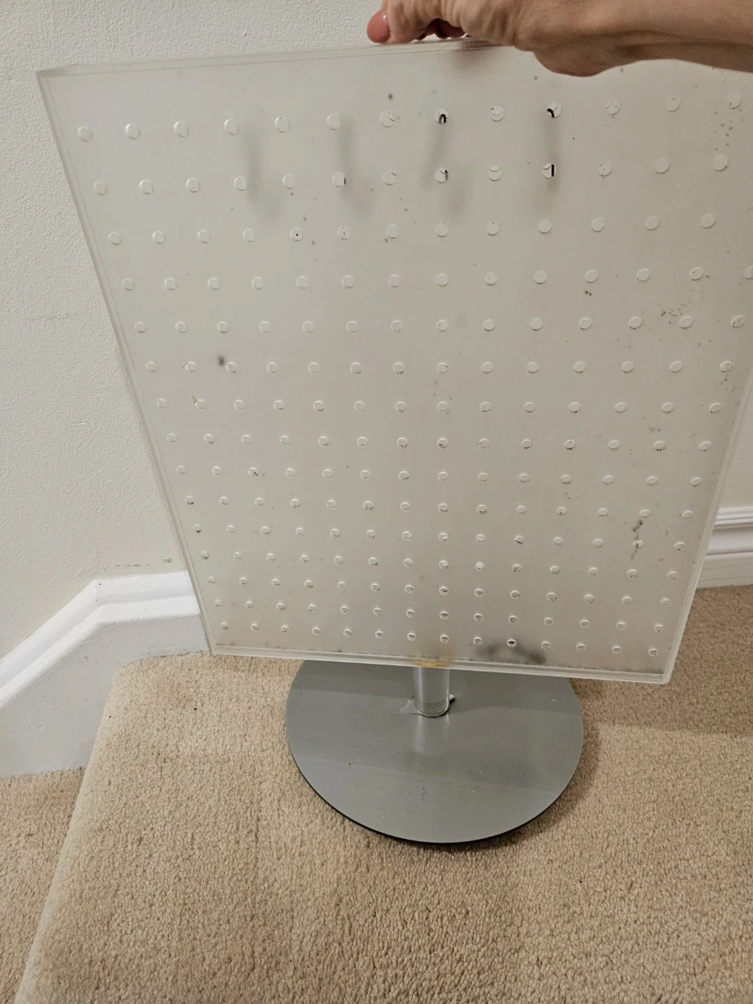 A plastic display panel for jewelry, sewing thread, or small tools. The stand is unfortunately broken, but you can glue this panel to the stand or attach it to a wall or shelf. If you're handy and want it, I' am offering it for free.
