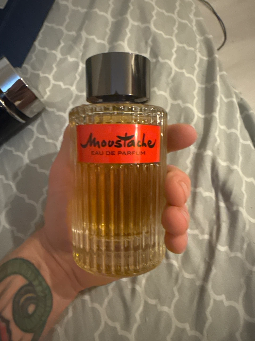 This is Moustache Eau de Parfum for men. It's a fragrance with a distinctive scent. The bottle is made of glass and has a textured design.120 ml