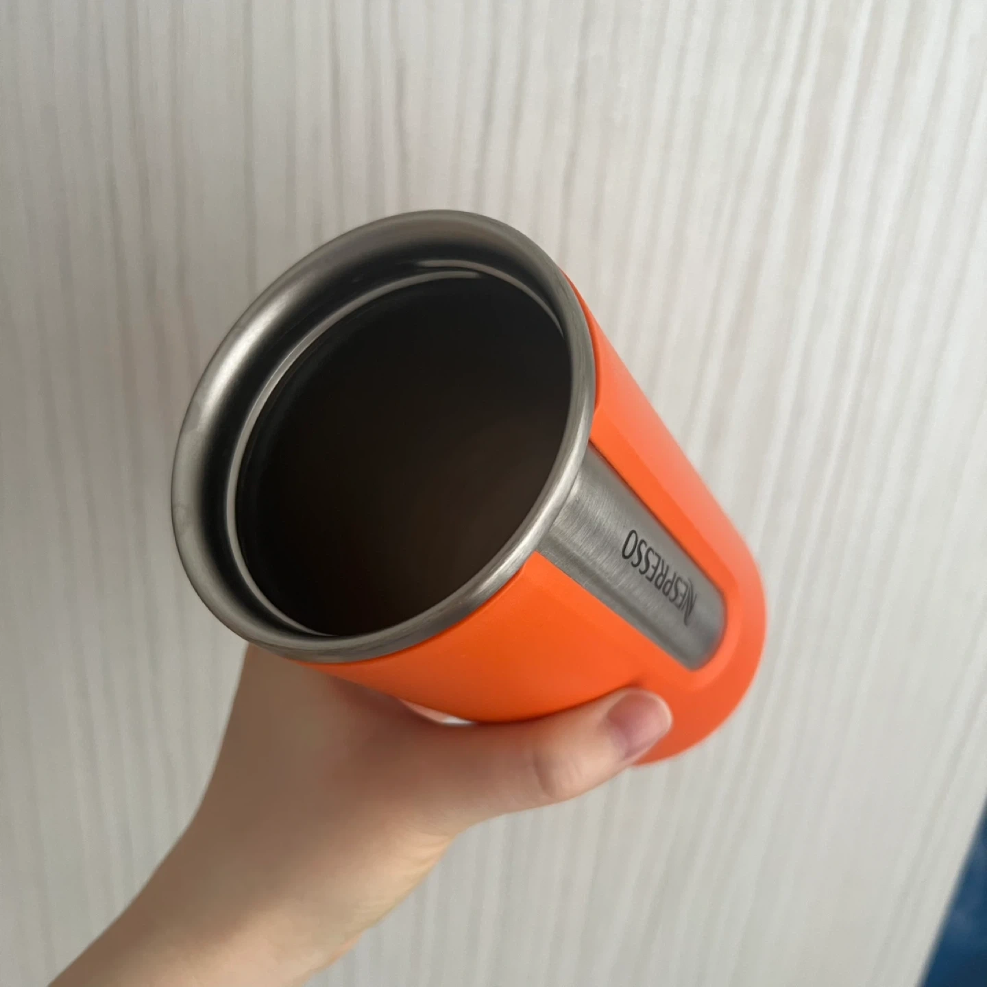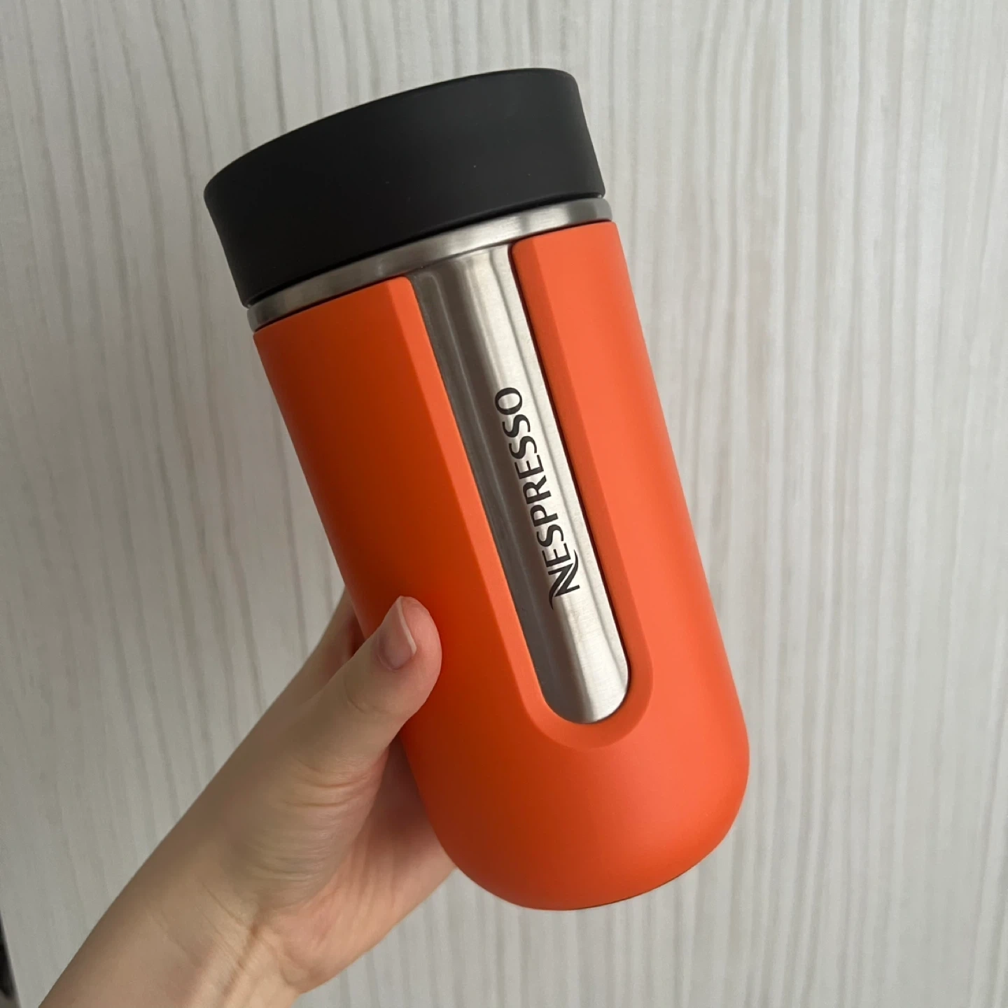 This orange Nespresso travel mug is perfect for keeping your drinks warm on the go. It's made with stainless steel and has a durable outer shell. Handy for commutes or outdoor adventures!