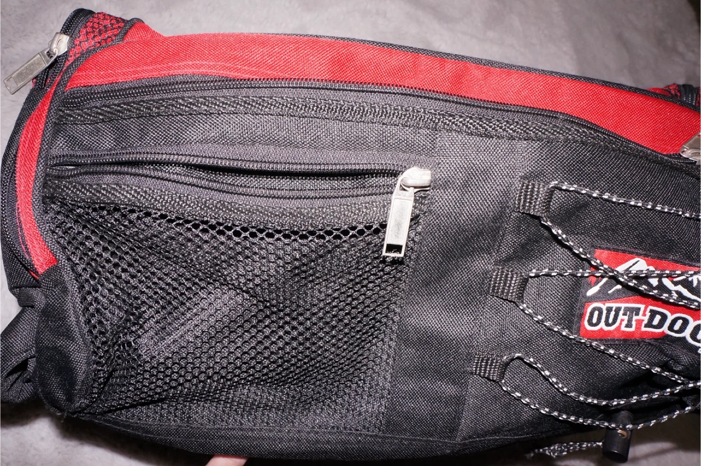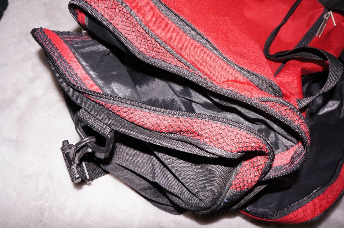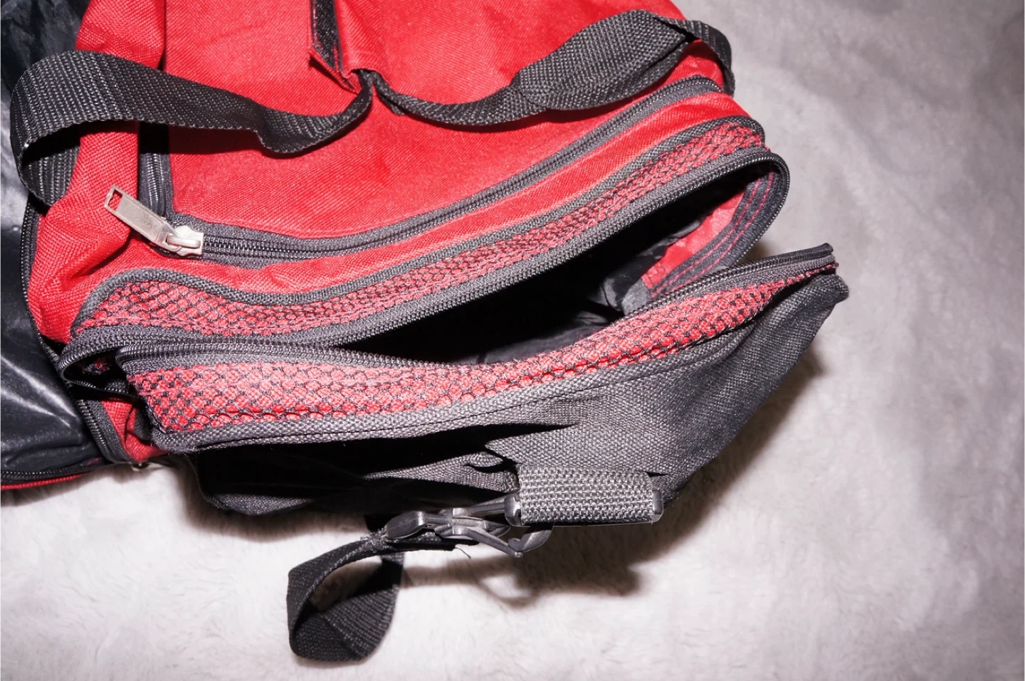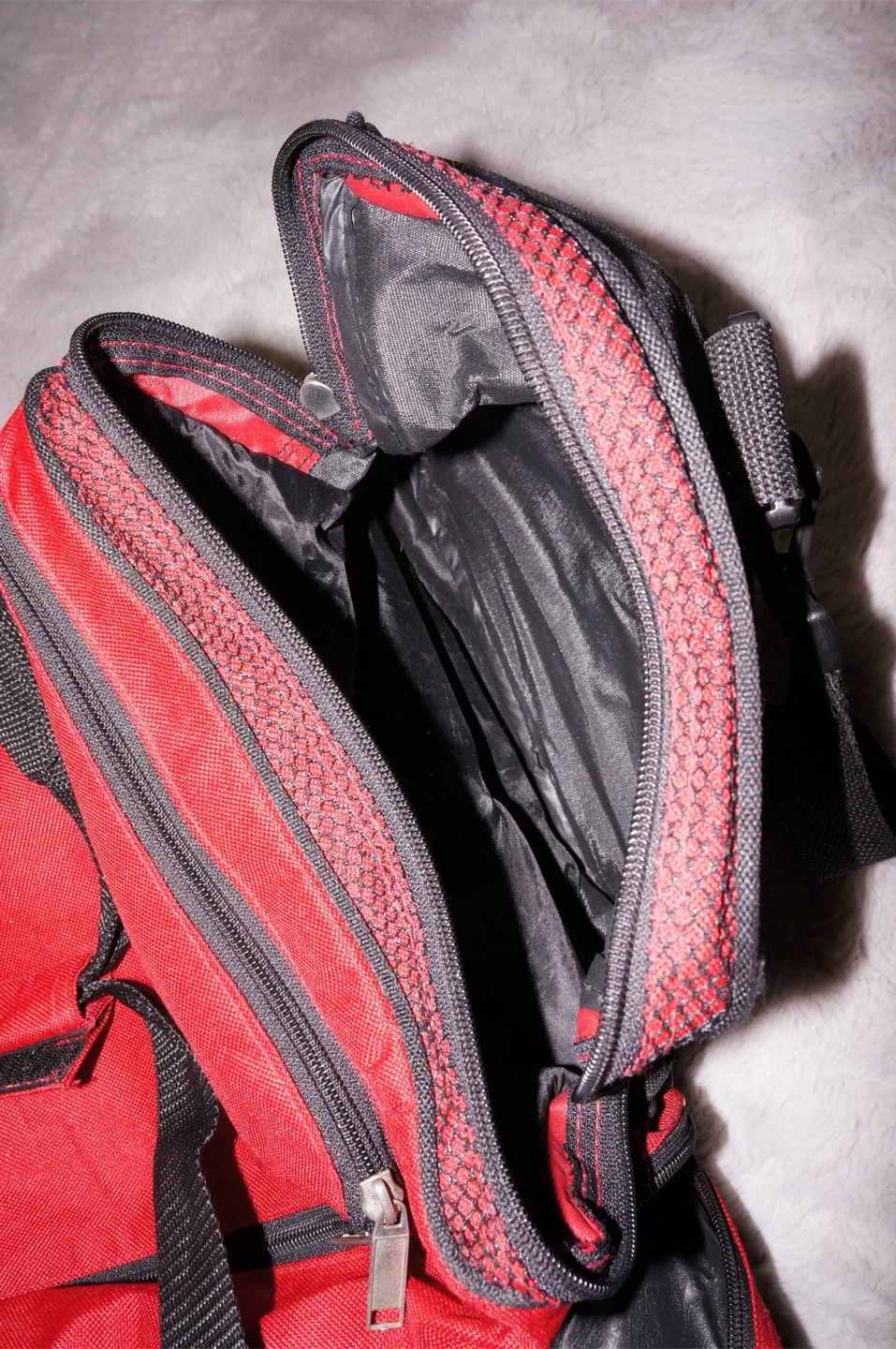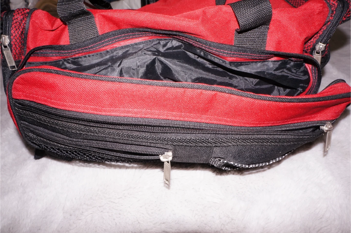 This is a red and black duffel bag with multiple zippered compartments. It features a main compartment and additional pockets for organization. Constructed from durable fabric.