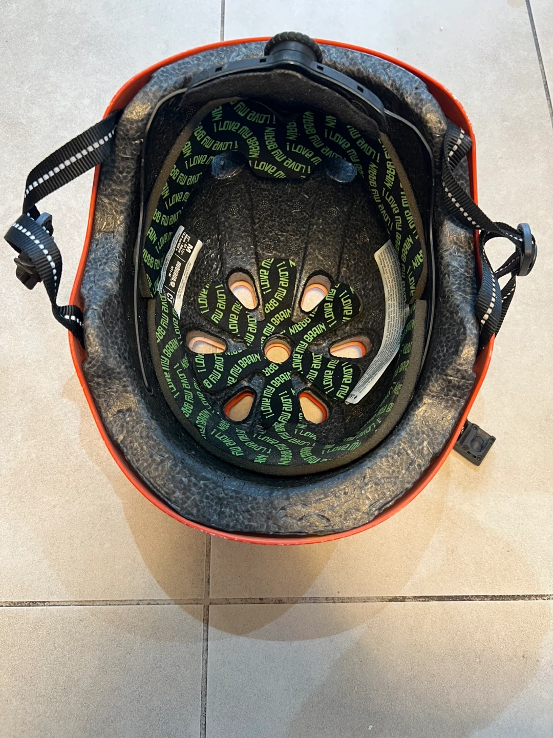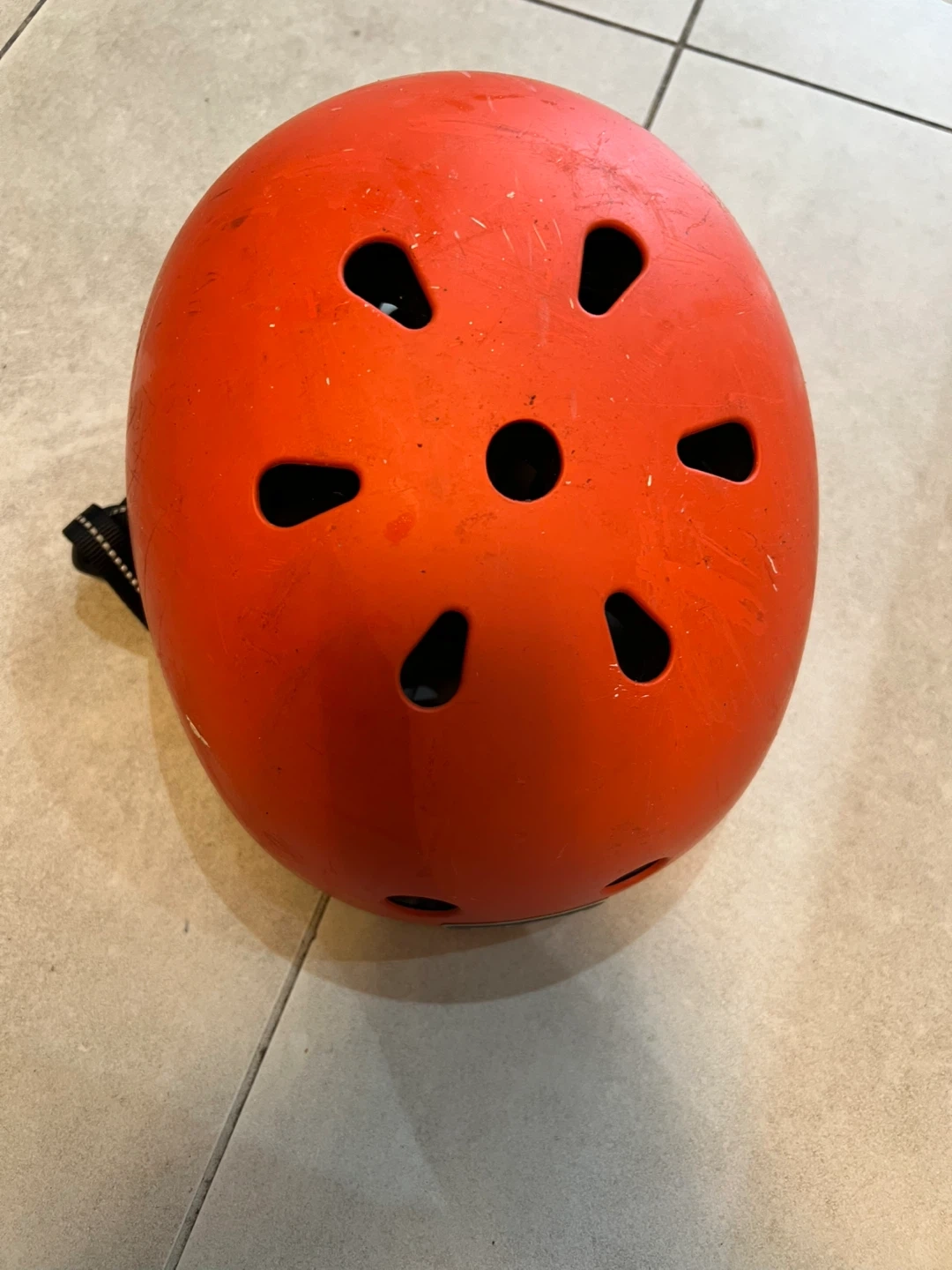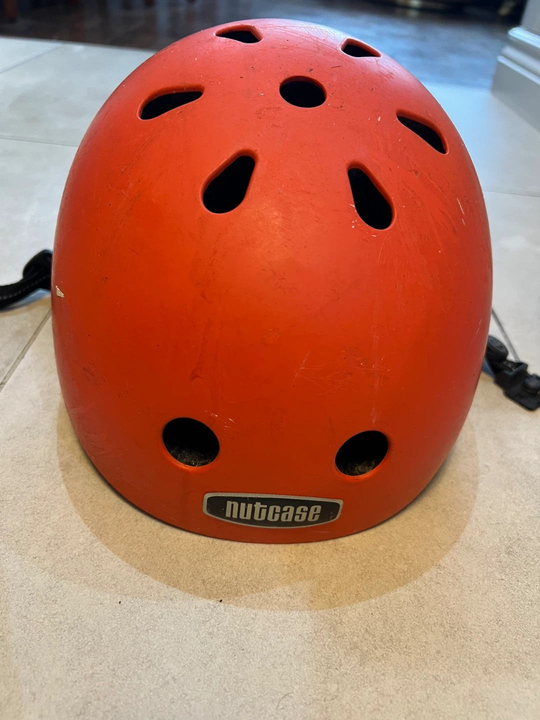 Orange Nutcase helmet for cycling or other activities. It features adjustable straps for a secure fit and ventilation holes to keep you cool. This helmet is designed for safety during active play.