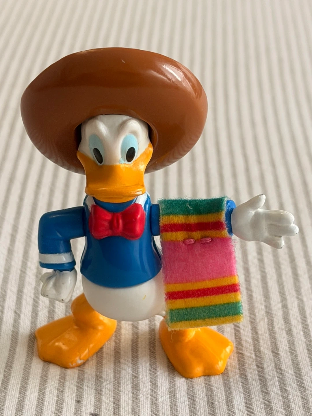 This is a Donald Duck toy figure dressed in a sombrero and a colorful serape. The figure is made of plastic. It's a fun collectible piece!