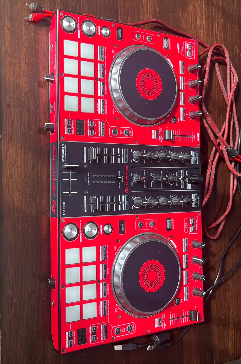 This is a red Pioneer DDJ-SR performance DJ controller. It's designed for DJs looking for a compact and versatile unit. It includes performance pads and jog wheels for creative mixing.