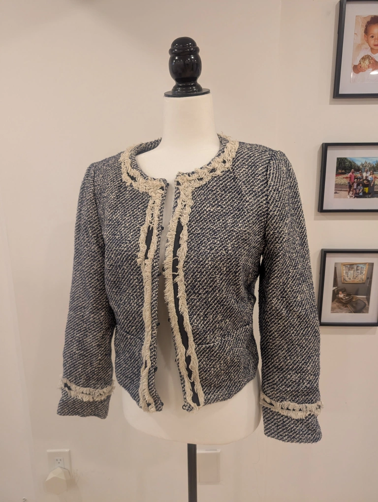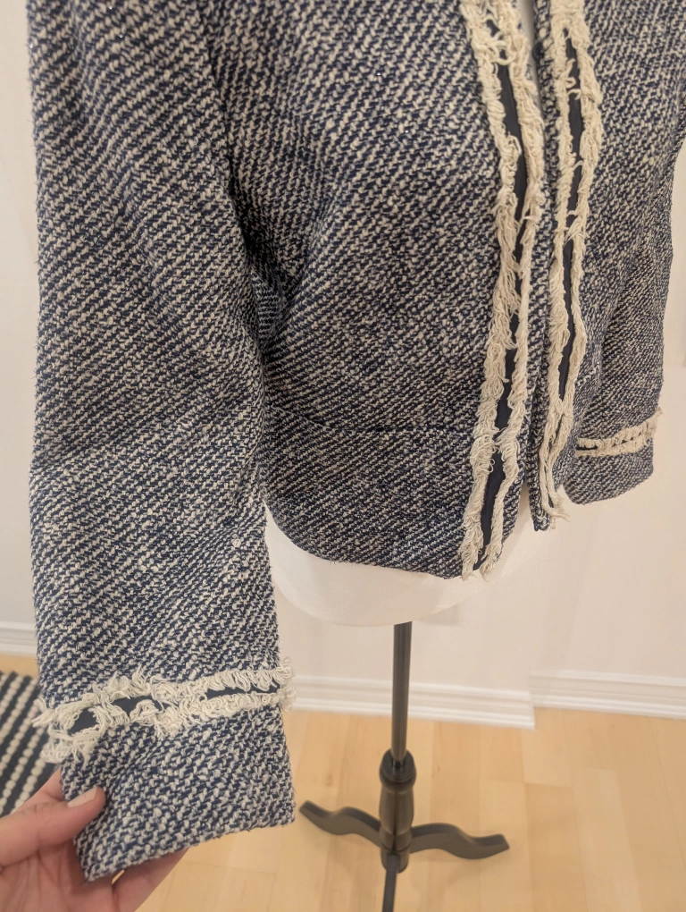 This is a lovely Tory Burch tweed jacket in a size 8. It features a navy and cream tweed pattern with decorative fringe detailing around the edges. Crop fit is tres cute and creates a unique flaire when added over a tank whether you are going for a work meeting or dinner date in jeans. Perfect for adding a touch of sophistication to any outfit!