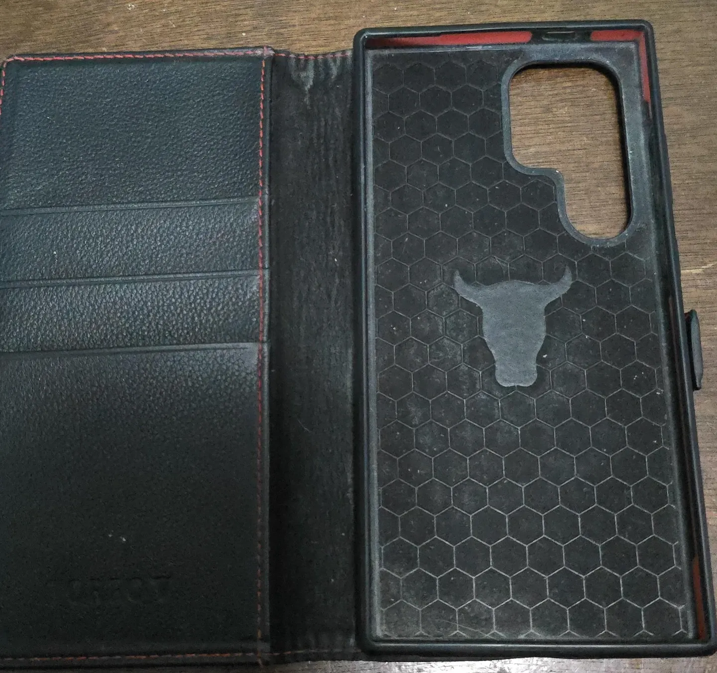 This is a black leather flip-style phone case. It has multiple card slots inside for convenience. The inside of the phone holder section features a textured honeycomb pattern and a bull emblem.