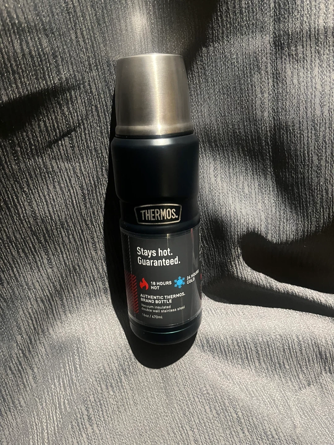 Thermos brand stainless steel bottle. It stays hot for 18 hours and cold for 24 hours. This double-wall insulated bottle is great for keeping your beverages at the desired temperature throughout the day.