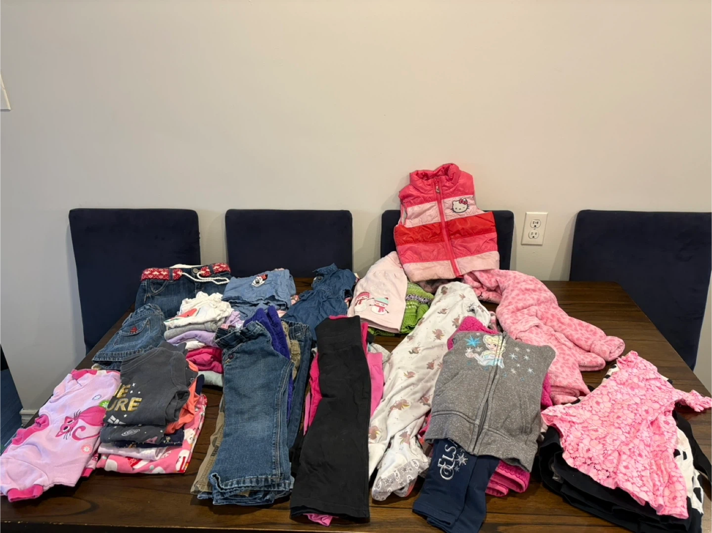 A mixed bundle of girls 2T clothing including jeans, pants, long and short sleeved shirts, pjs, sleepers, skirts, shorts, dresses, sweaters, housecoat and a Hello Kitty vest.