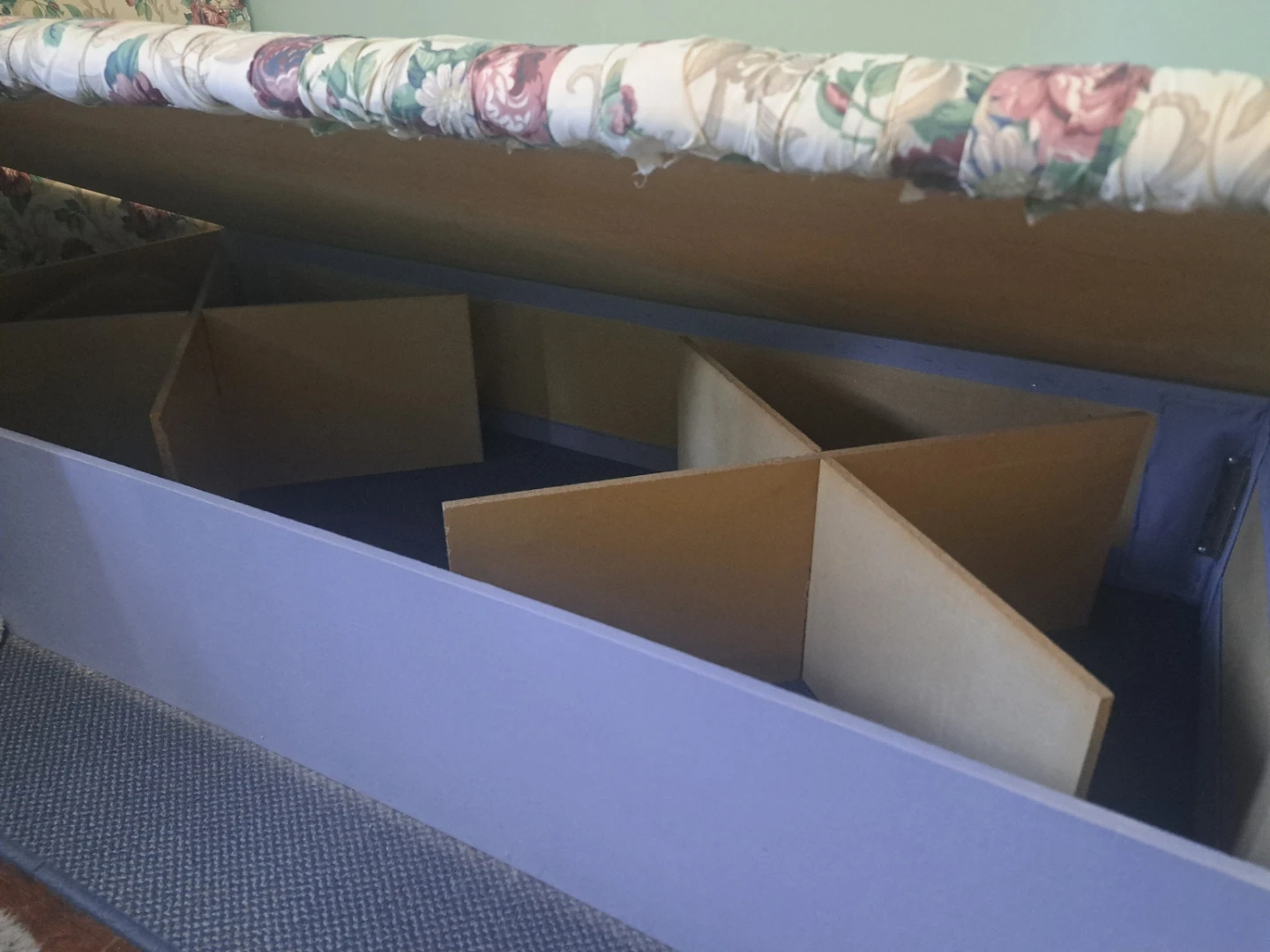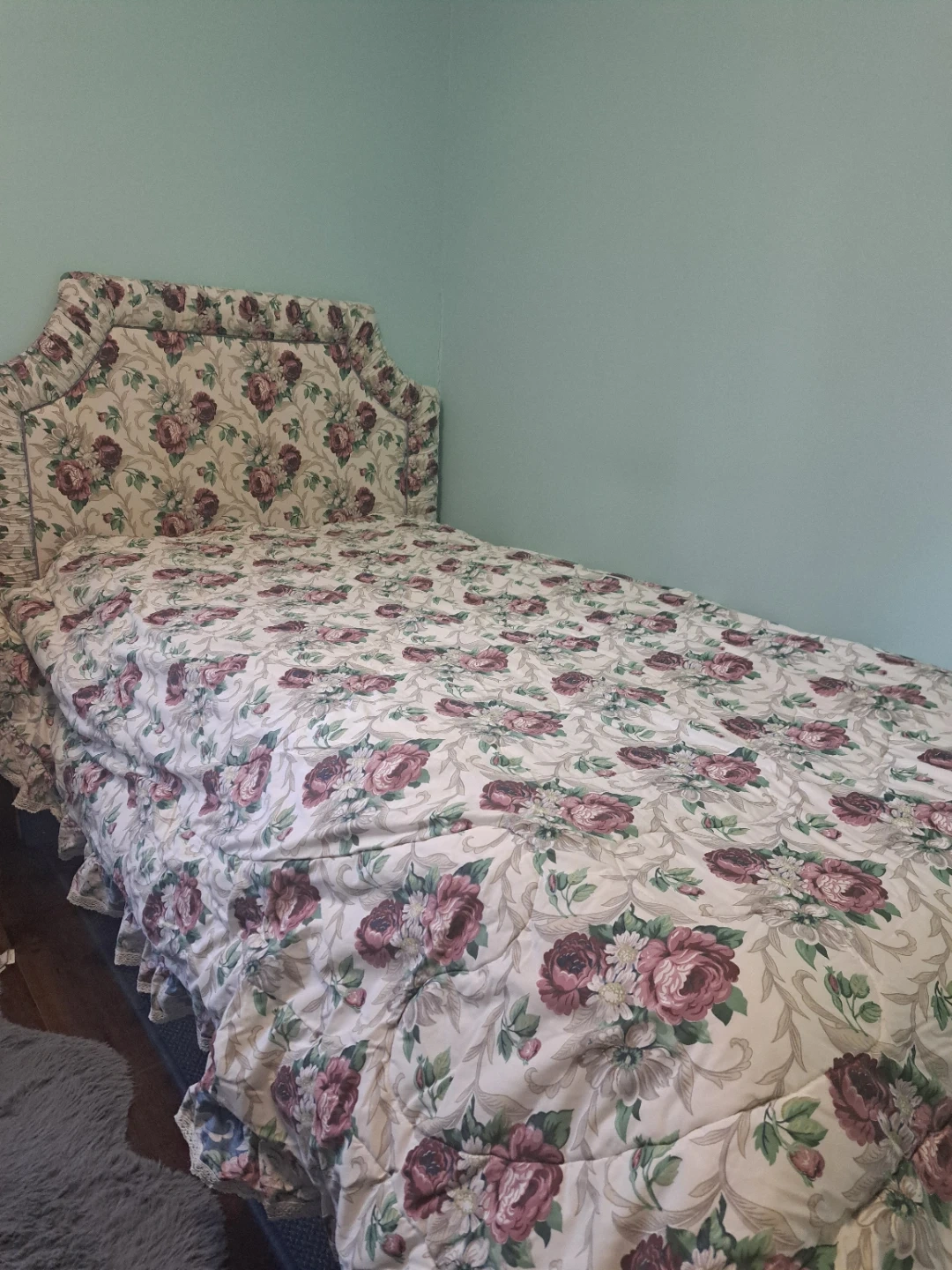 Twin bed frame for sale (mattress not included). No boxspring needed, platform bed, very sturdy. All homemade. Comes with reversible comforter and pillow shams. Great for a little girl or tween!