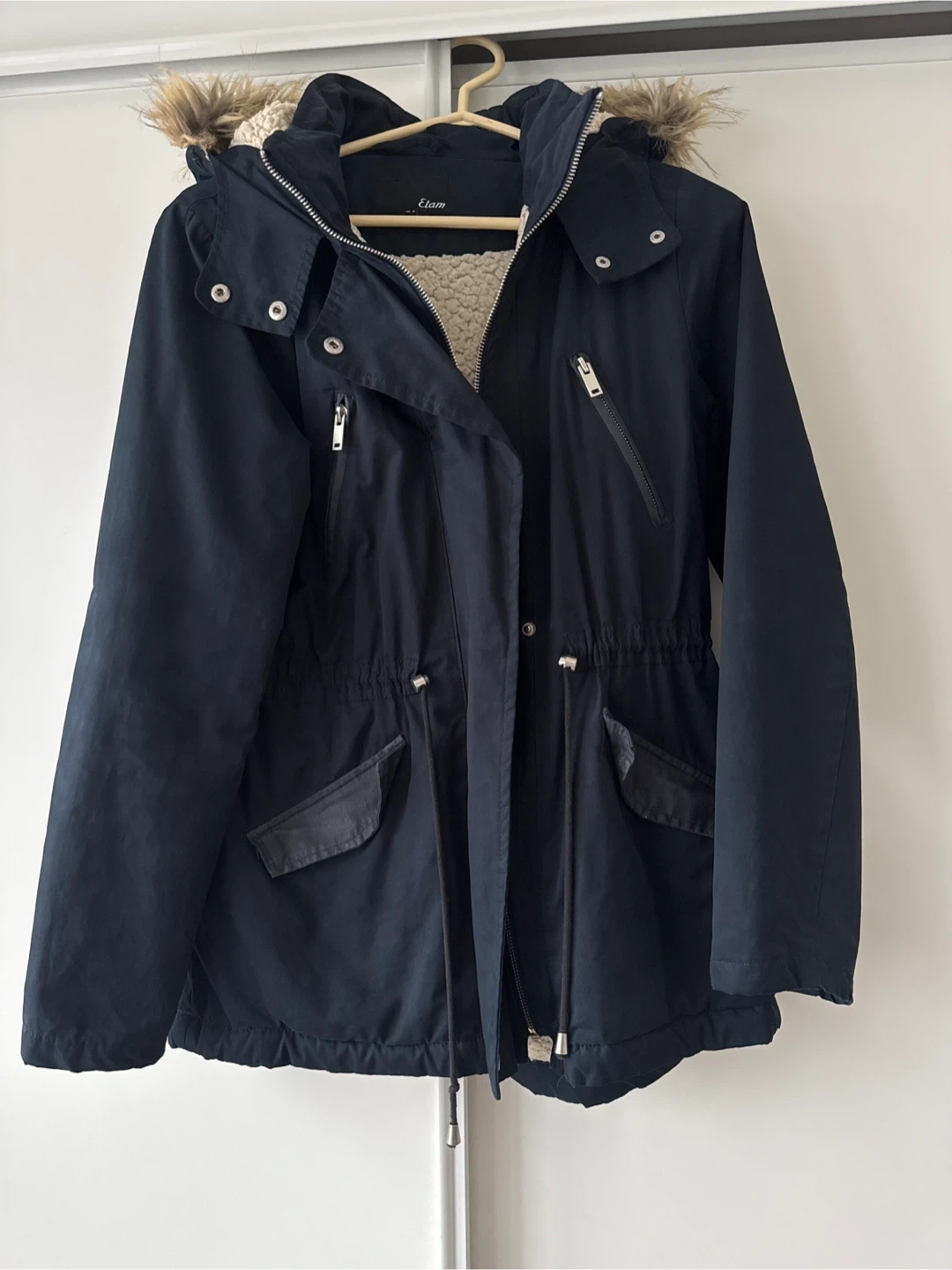 I'm selling a stylish navy blue winter parka from Etam! It's perfect for staying warm during those chilly Canadian winters. The parka features a faux fur-lined hood and a drawstring waist for a flattering fit. It's in great condition and ready for a new owner!