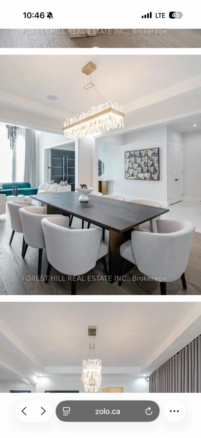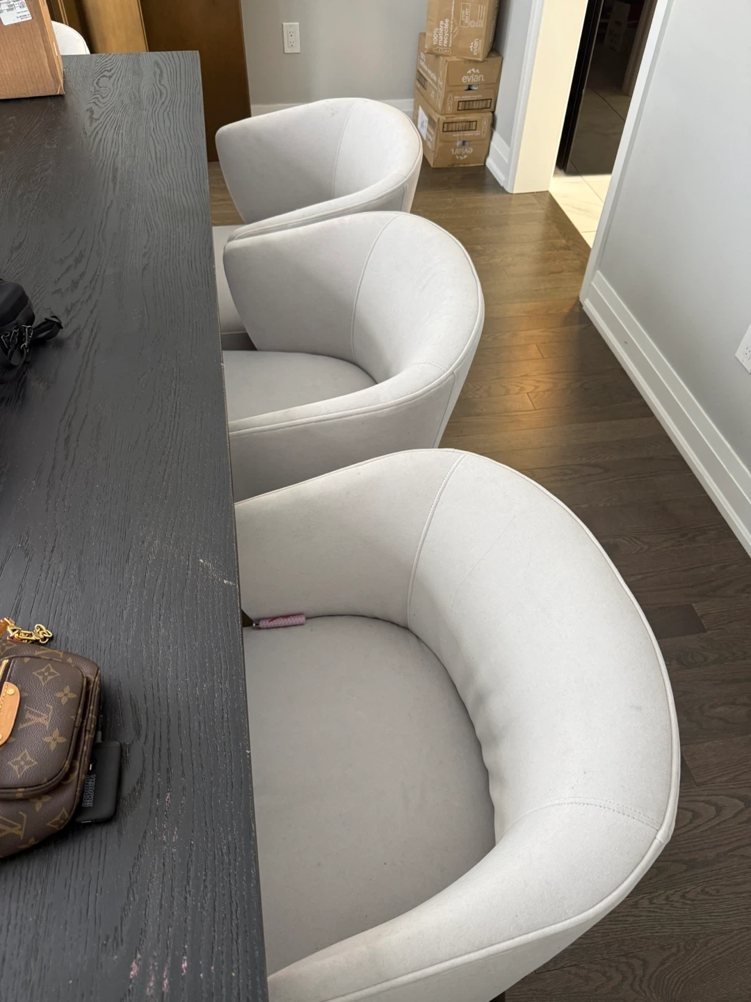 Six comfortable dining chairs with a light grey upholstered finish. These chairs offer a modern, curved design that complements a variety of dining tables. They're perfect for seating family and guests during meals.
