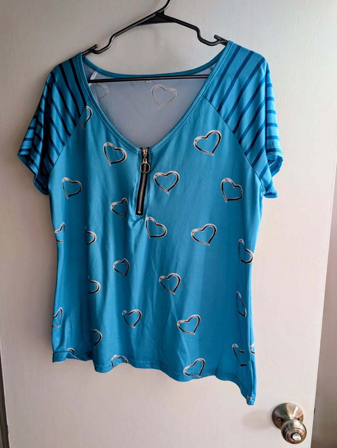 Casual blue t-shirt with a fun heart print all over. It features short sleeves with a striped pattern and a convenient zipper at the neckline. The material is soft and breathable, making it a comfy choice for everyday wear.