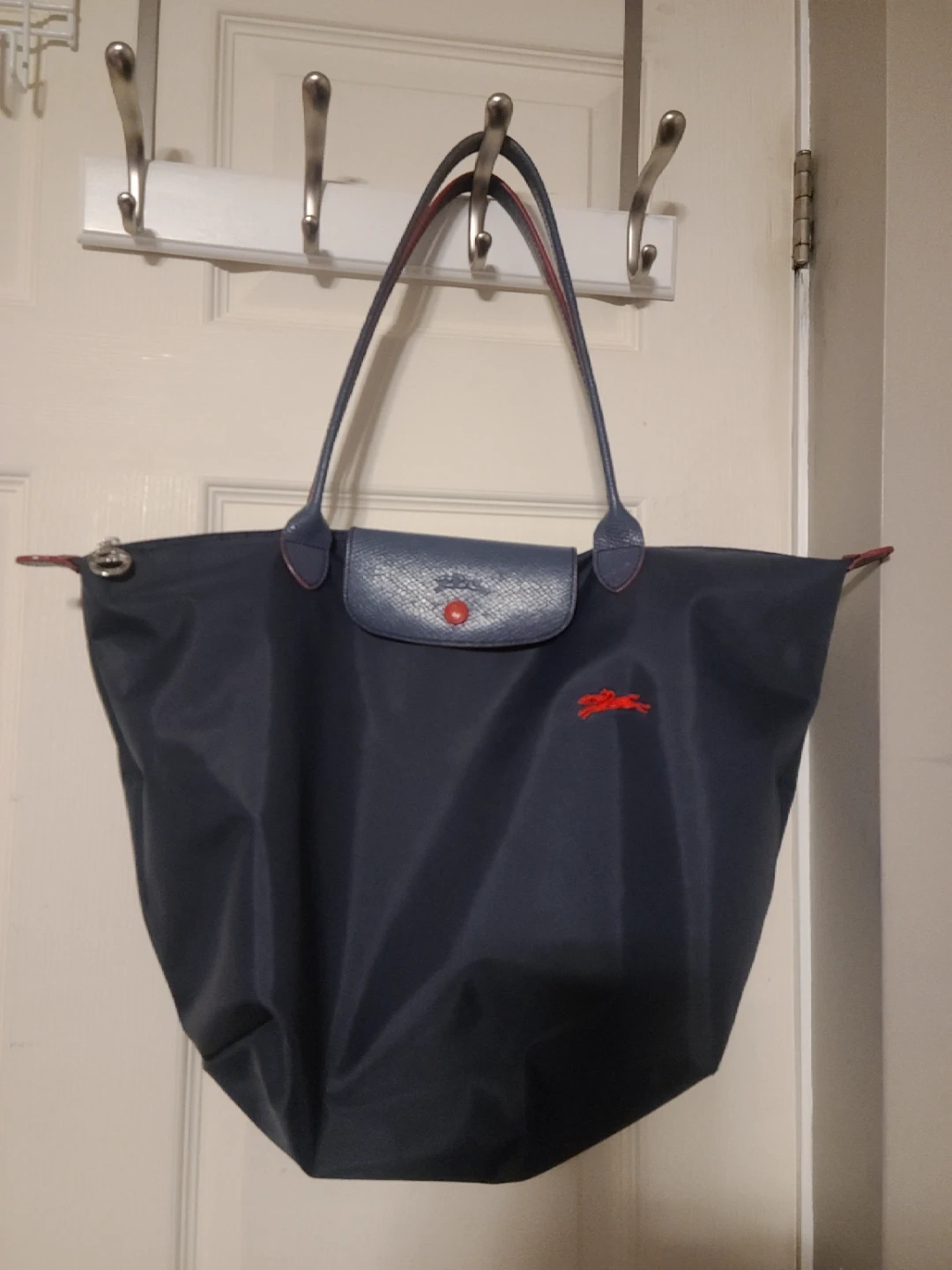 This is a beautiful Longchamp Le Pliage tote bag in a navy colour. It has leather trim and handles. It's a classic and versatile bag for everyday use!
