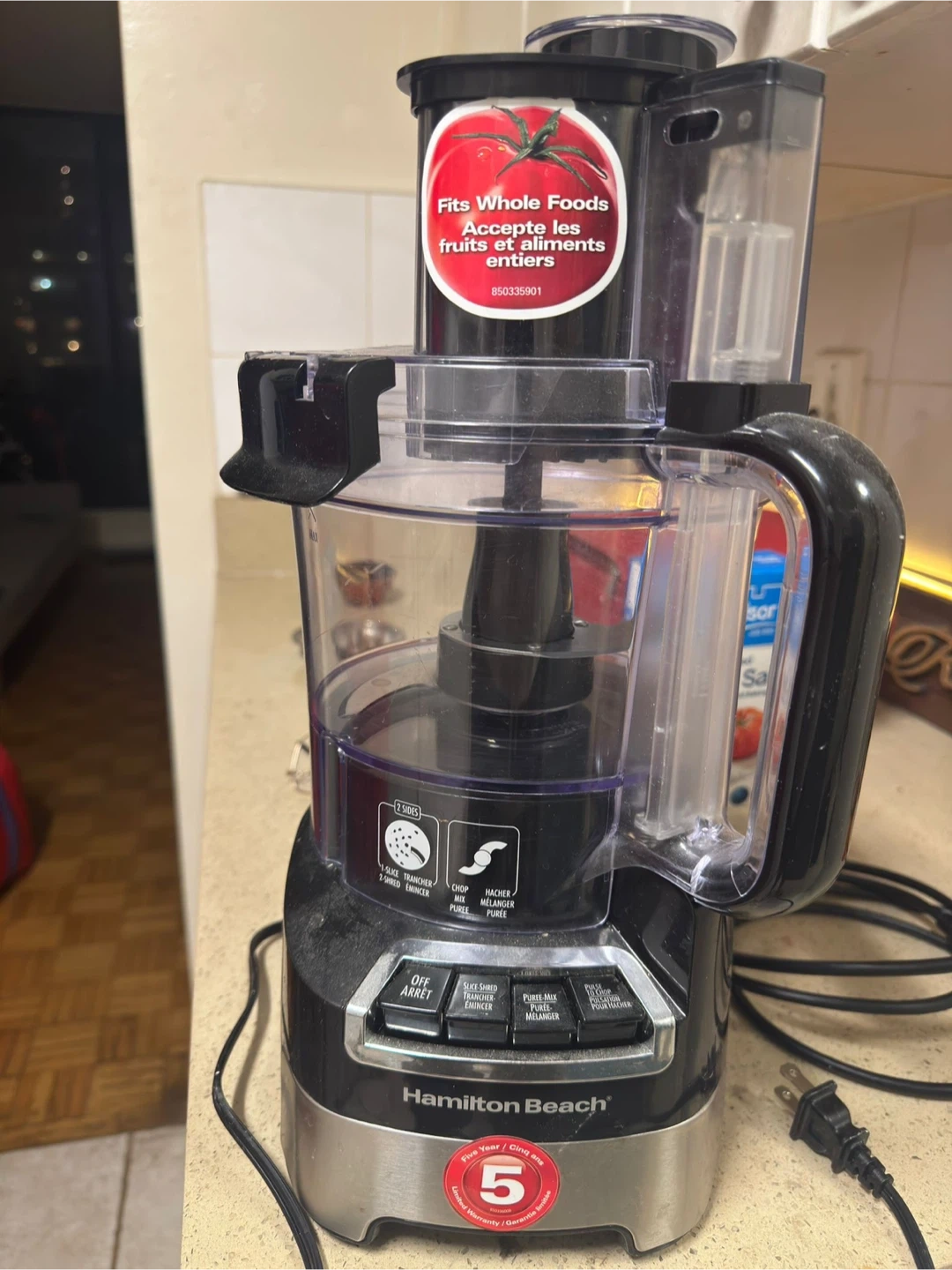 Selling a Hamilton Beach food processor. It features two sides for slicing and shredding, as well as chopping, mixing, and pureeing. It also has a part that says 'Fits Whole Foods'.
