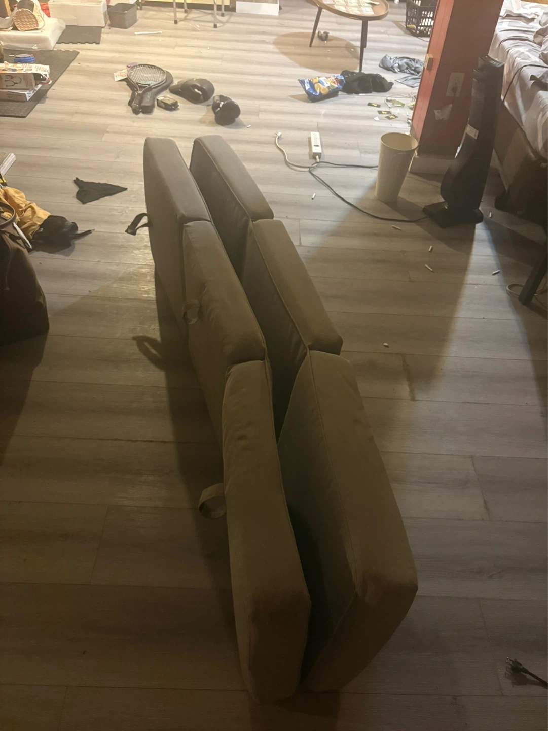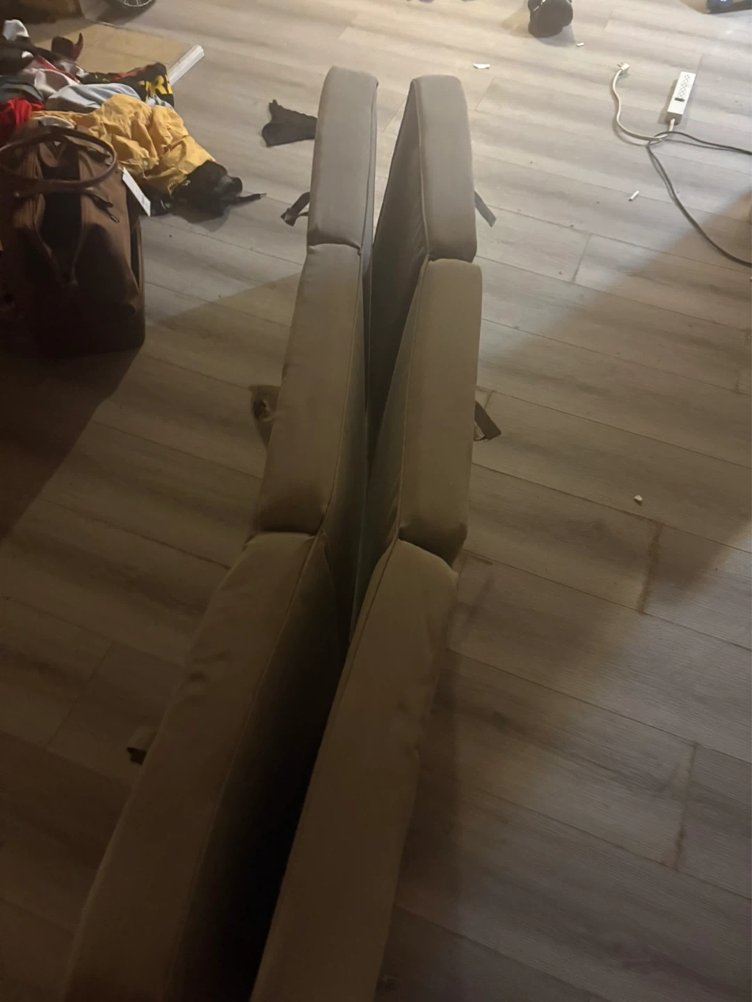 Two chaise lounge cushions in a neutral beige/grey colour. They're padded for comfort and seem to be weather-resistant. Straps are attached to secure them.