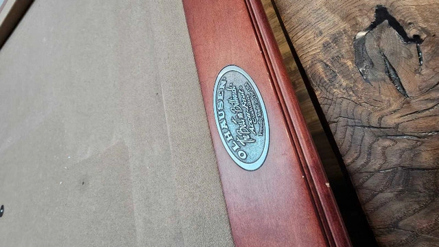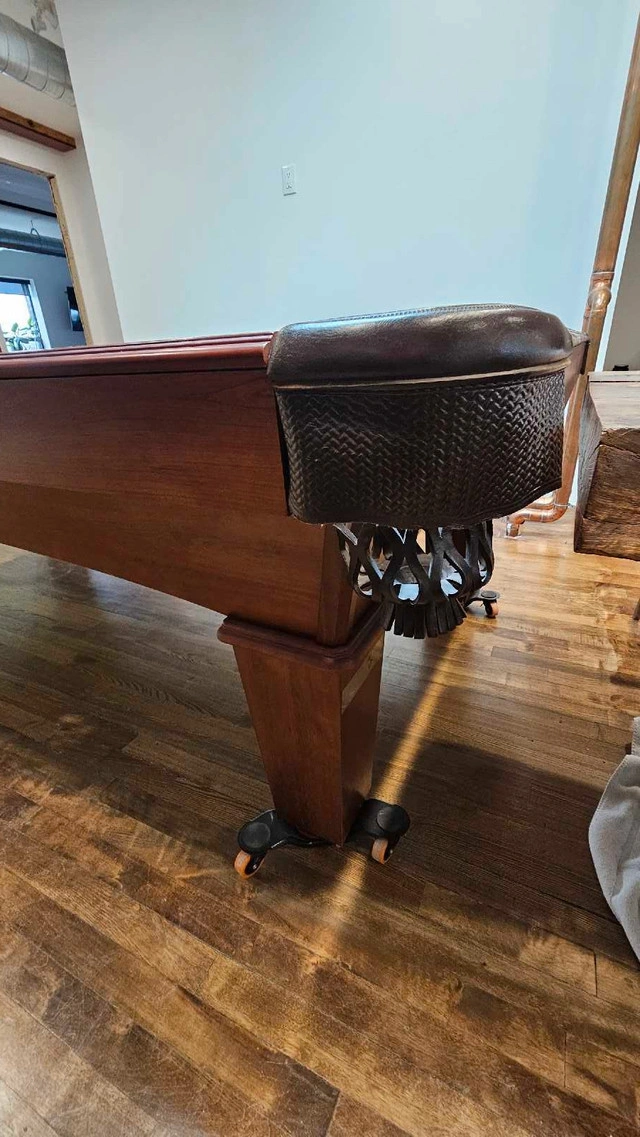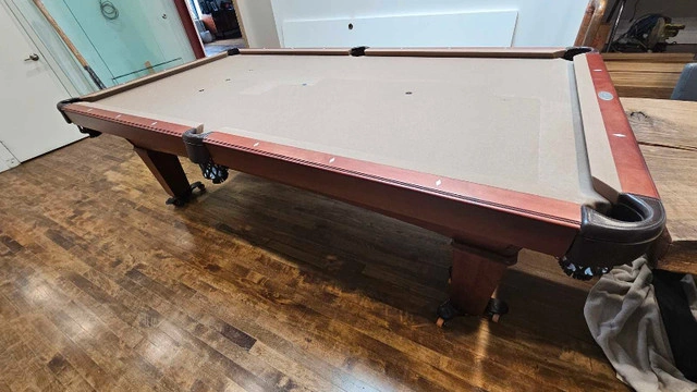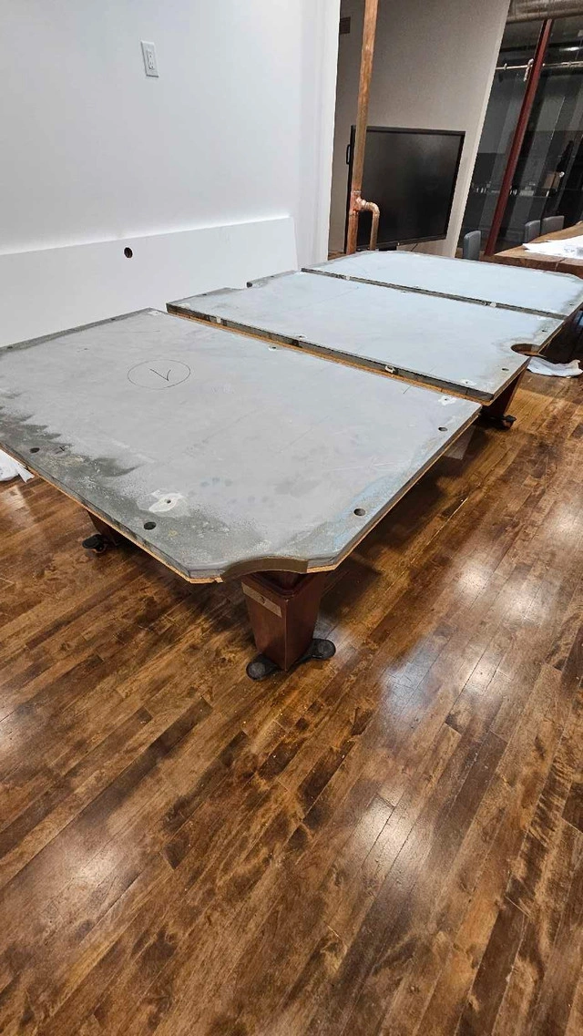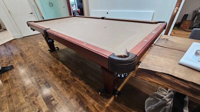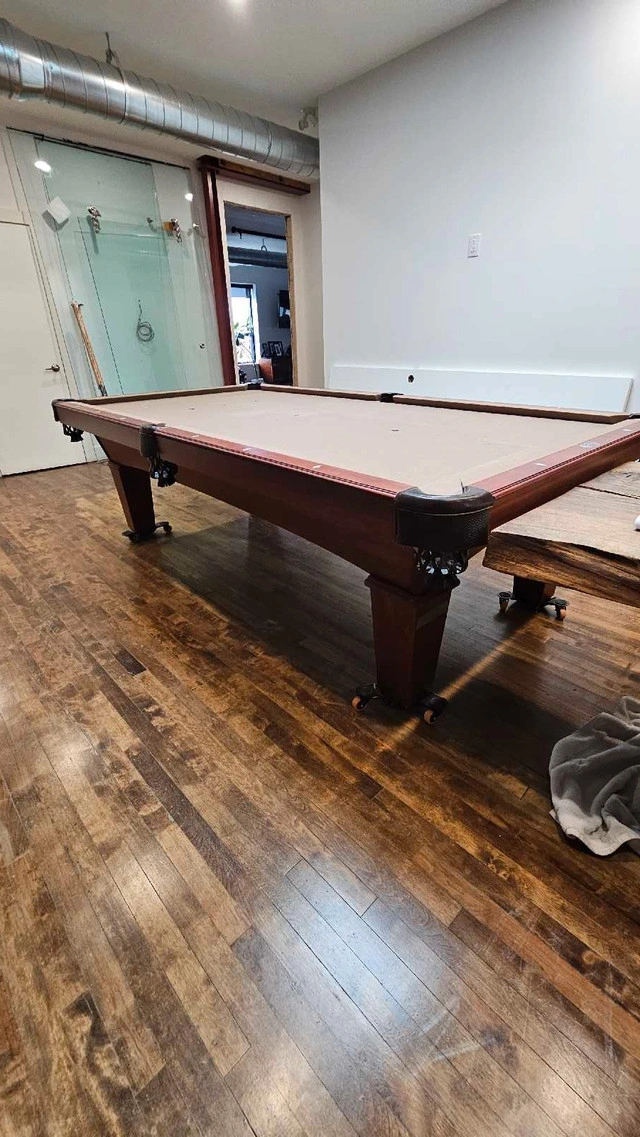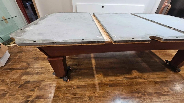 Used 4.5 x 9' Olhausen pool table with accessories, 1" slate, and leather pockets. All accessories included. ALEX BILLIARD SERVICE 416-716-6707. We do work on all table types and sizes: 7', 8', 9', 10', 12'. We also offer a wide range of billiard and gaming supplies, ping pong tables, foosball tables (fabi, roberto, garlando), air hockey and bubble hockey, poker tables and chips, cues and cases, and billiard lights. We will position the table for optimum playability or to your specifications. We will replace any worn or missing hardware and professionally assemble and level your table. We recommend using teflon coated championship cloth to prevent any potential water damage. We do work on all tables types and sizes (8', 9', 10', 12") and we offer 1 year warranty on leveling labor.