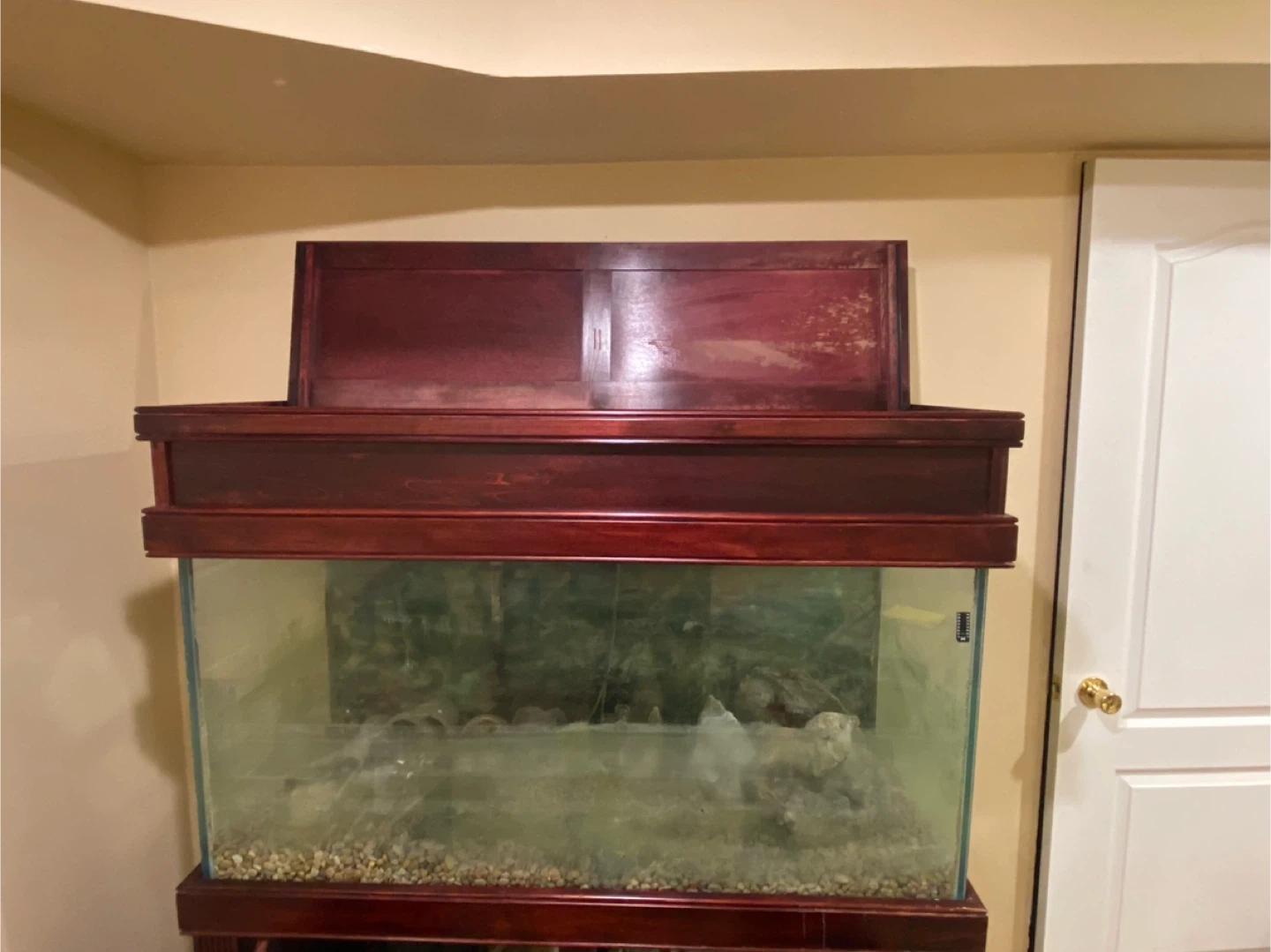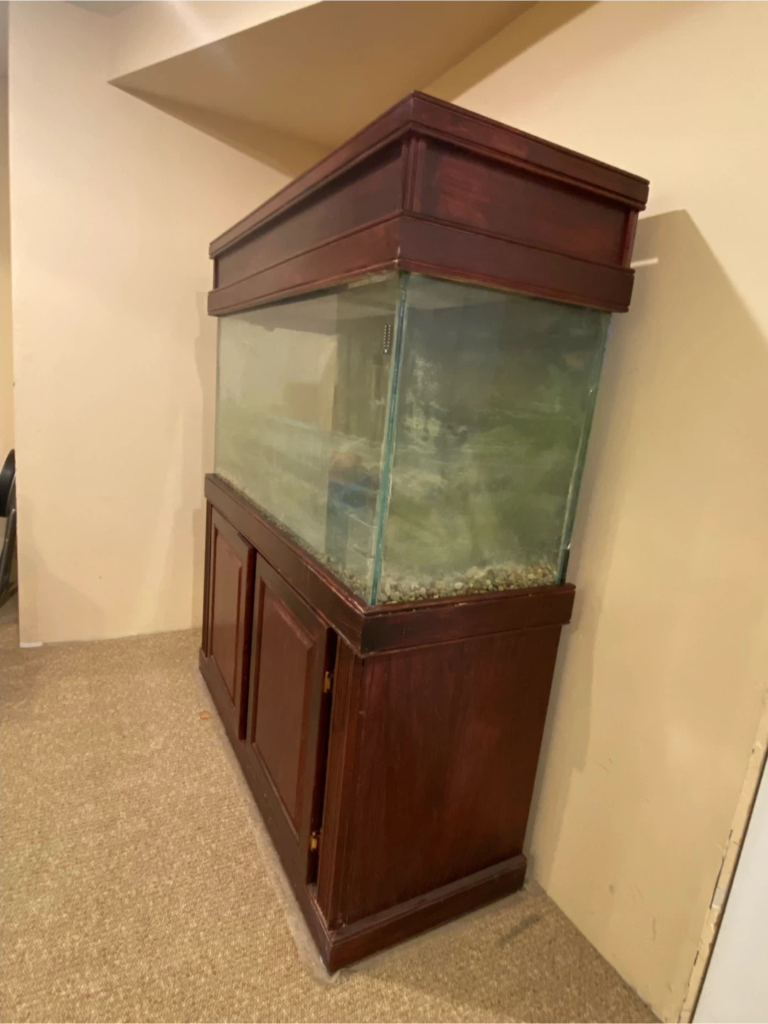 Selling a 90 Gallon fish tank with a wooden stand. Canopy And all accessories. Needs tank cleaning but It's in good condition and ready for a new home for your aquatic friends! The wood stand has a rich, dark finish that adds a touch of elegance to any room