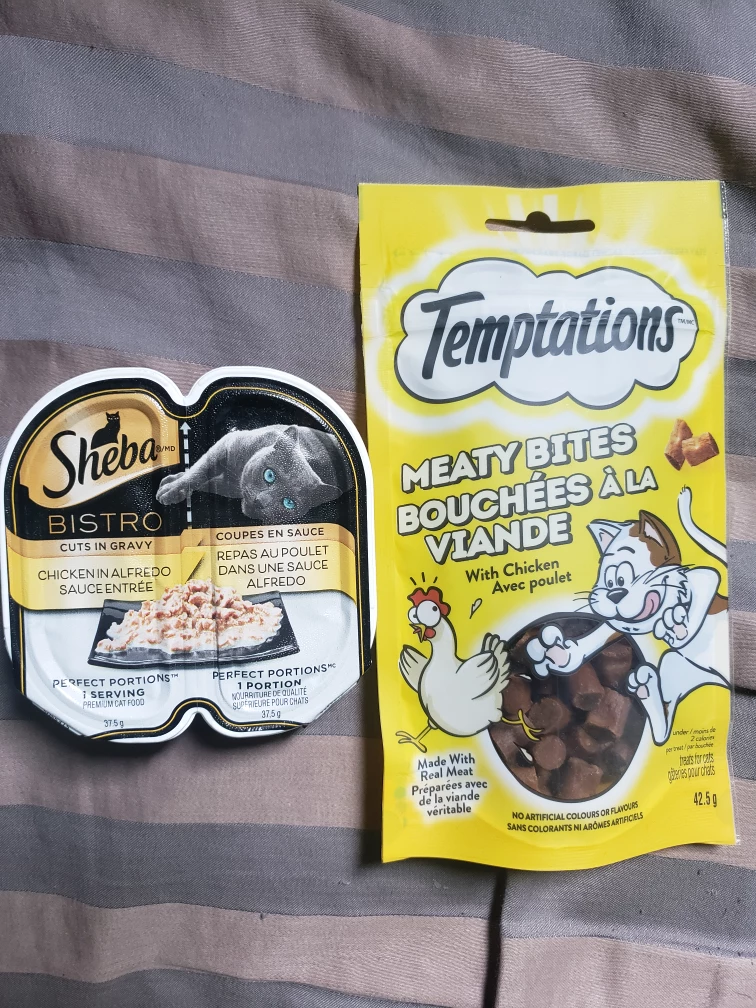Best before November 2024 for the Sheba Bistro chicken in alfredo sauce cat food and May 2024 for Temptations Meaty Bites
