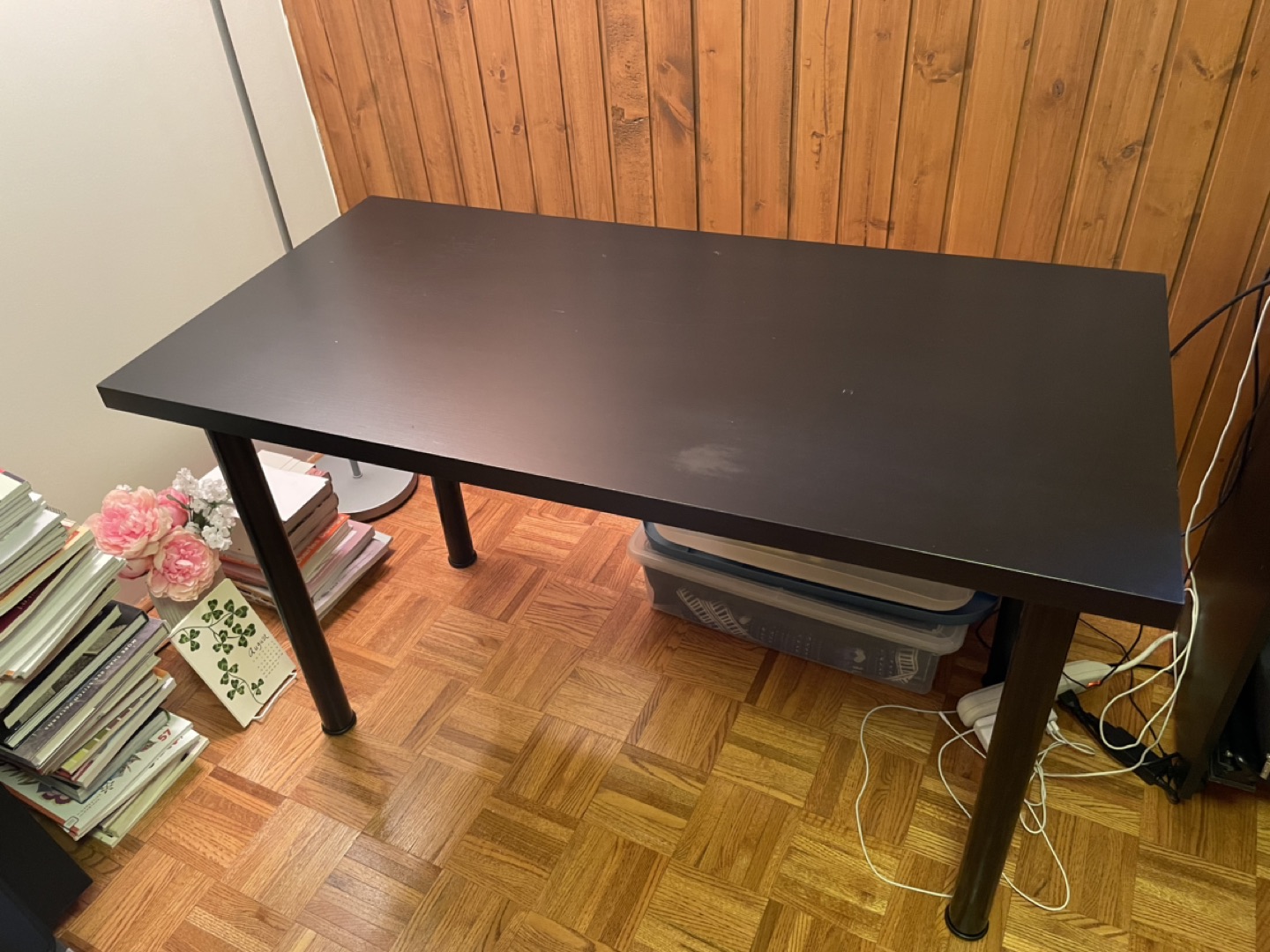 112Tabletop: 60 cm x 120 cm. Total height w legs: 74 cm. Tabletop has seen some wear and tear, but still perfectly functional. Please see photos. Would be great for kids or a workspace. Paid around $80 originally. Will be disassembled.
