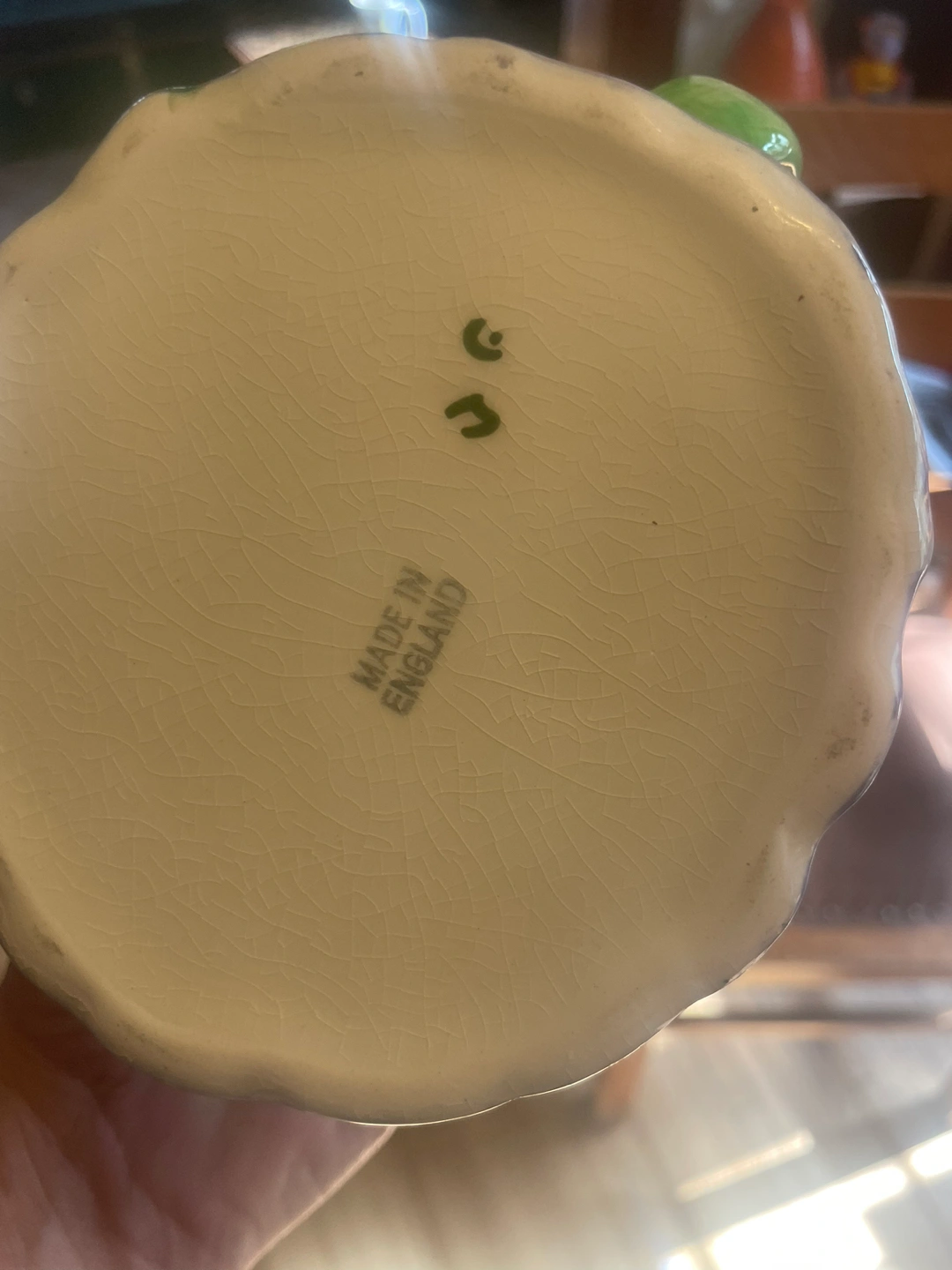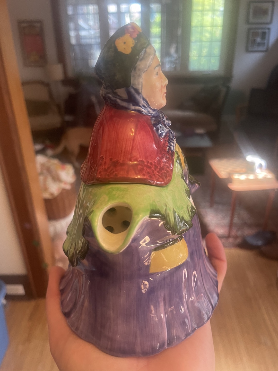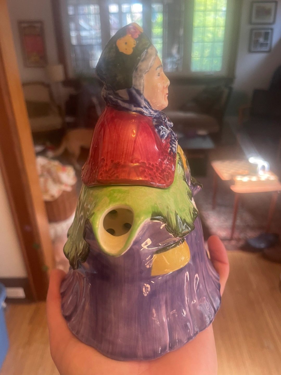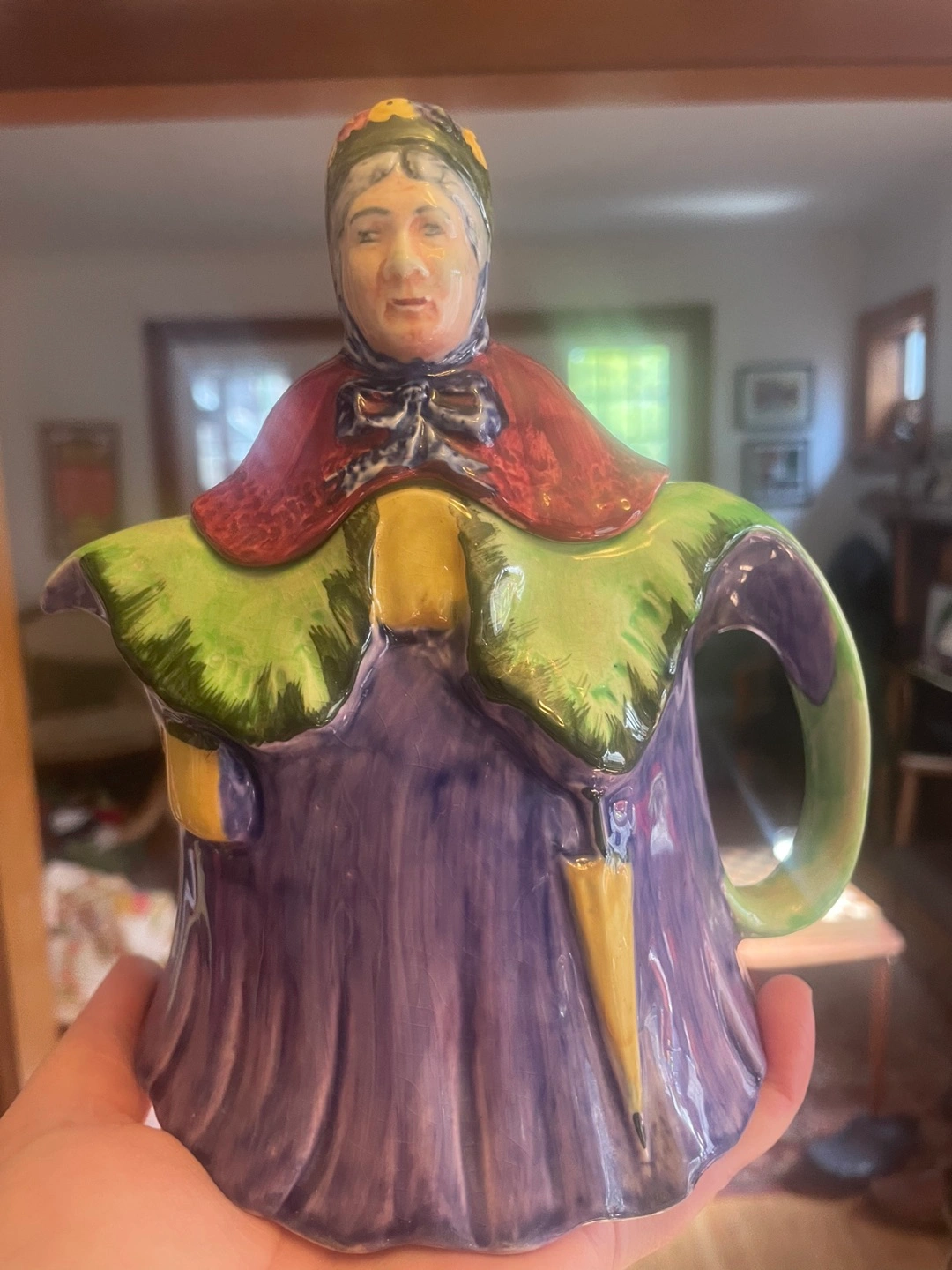 This quirky teapot is ceramic and made in England. The head pops off to fill with water.