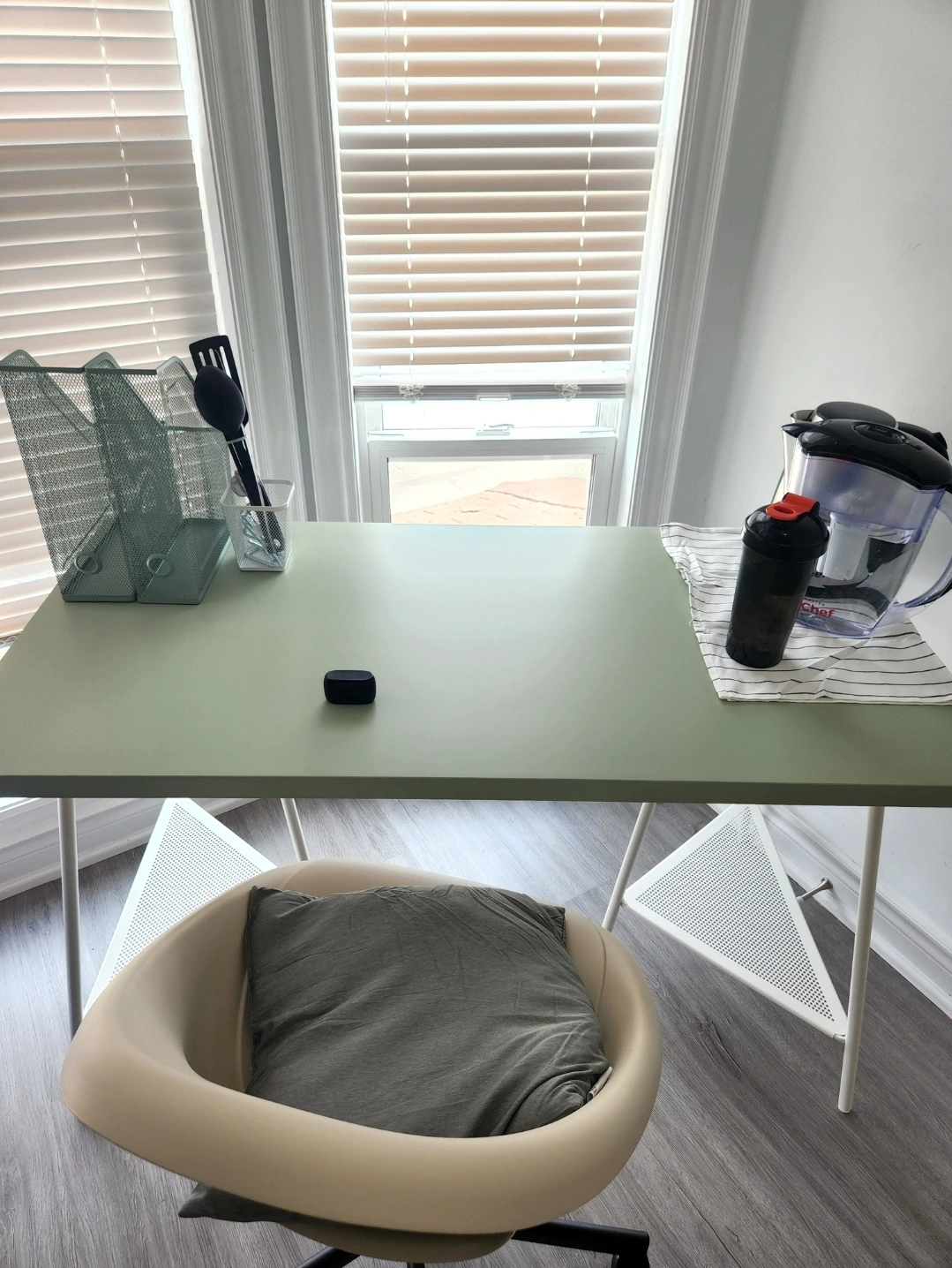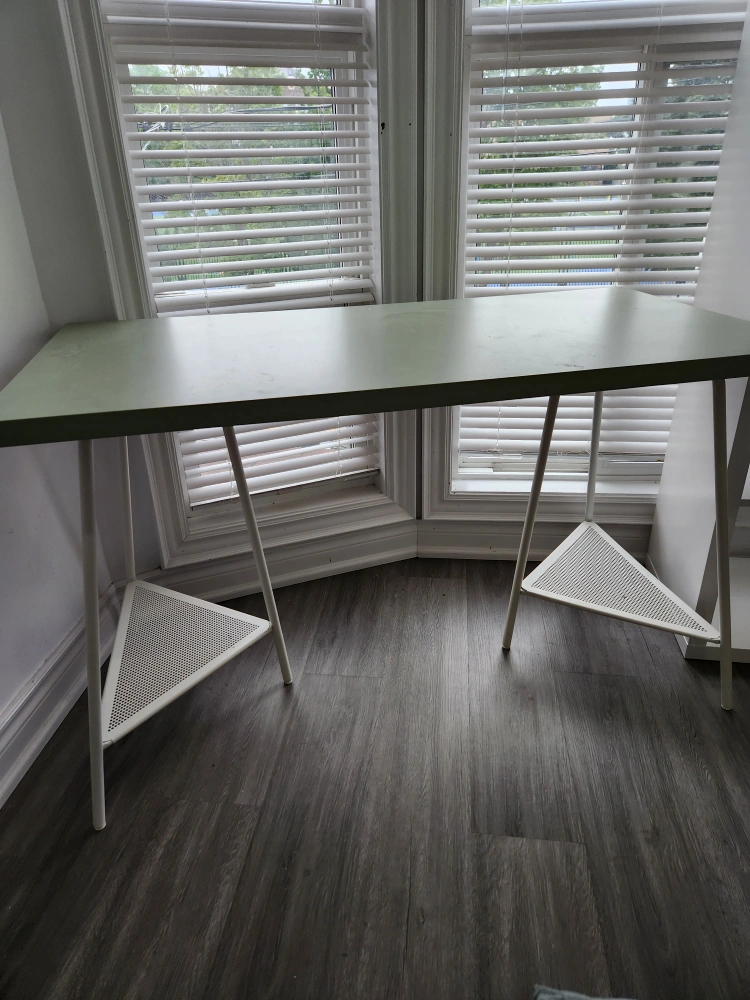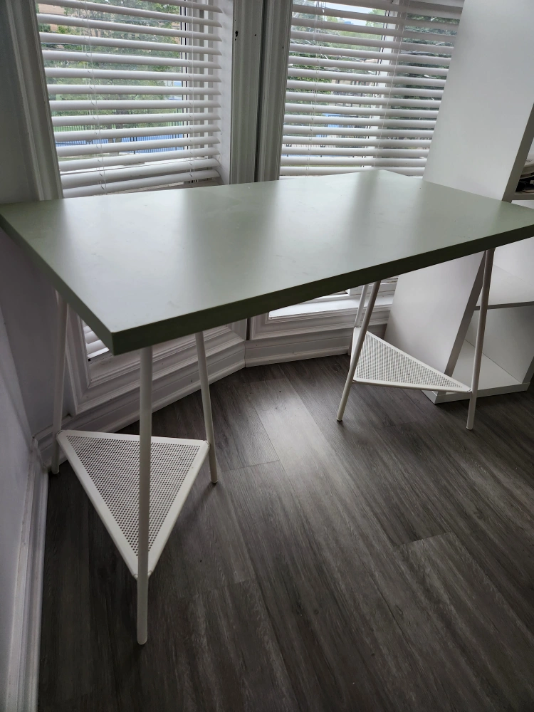 Big and pretty lagkapten desk from ikea, with a green/saje tabletop and white legs, with some storage shelves on the legs.