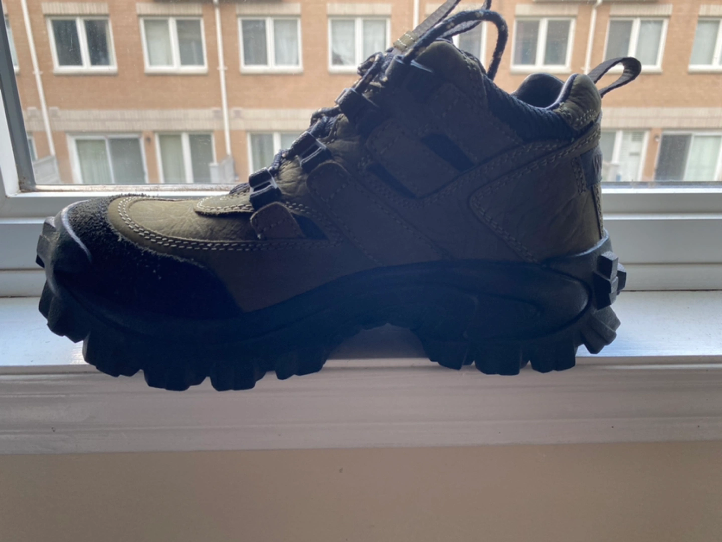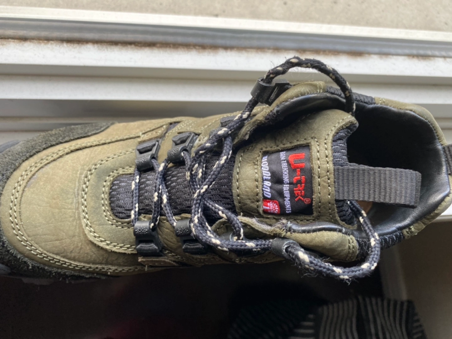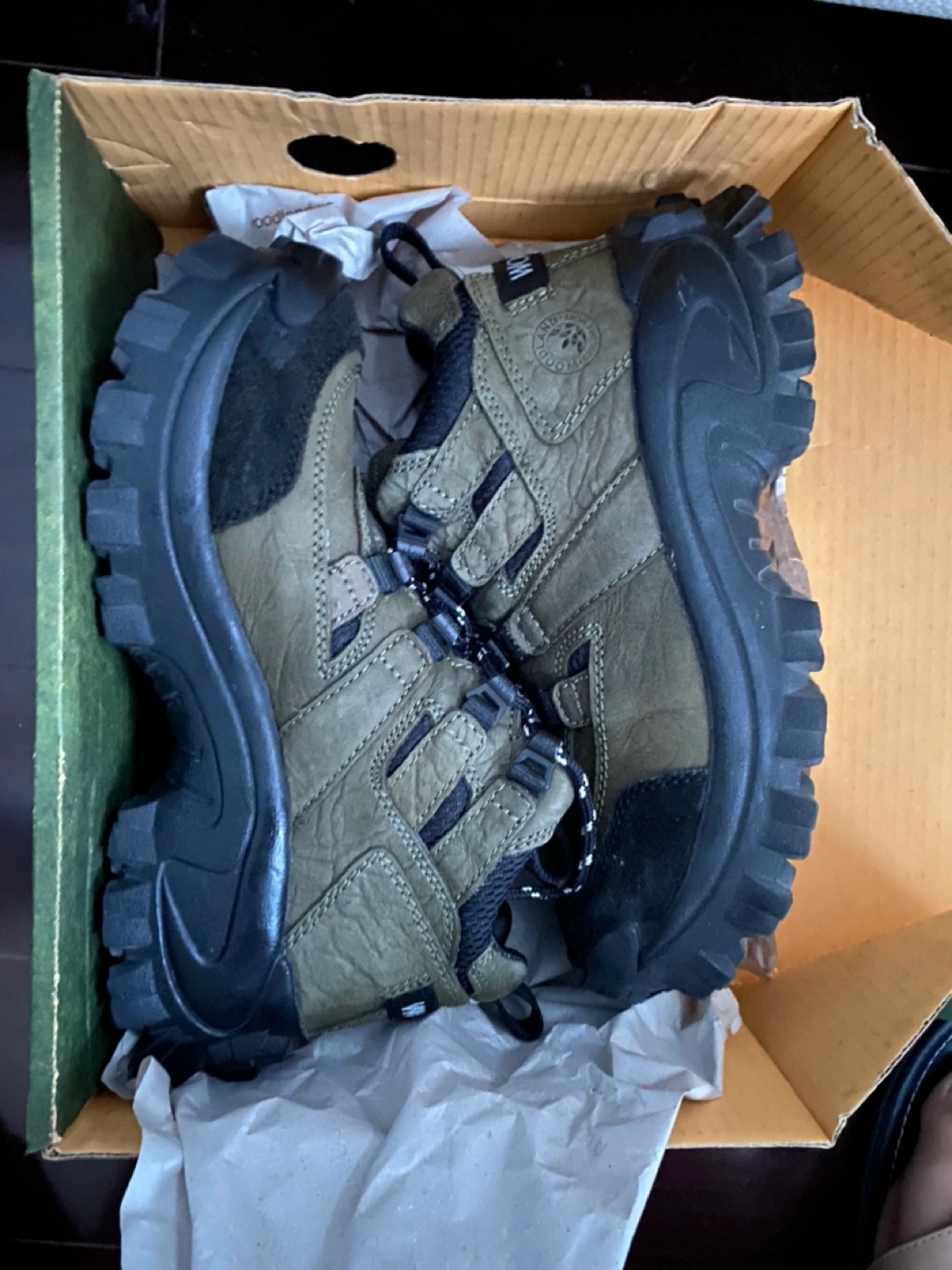 Woodlands men’s boots. Hiking or outdoor shoes. Worn only once. Like new. In original box. Olive green colour.
