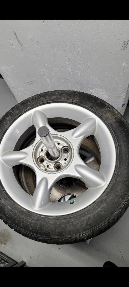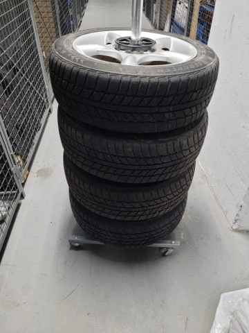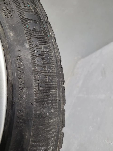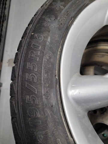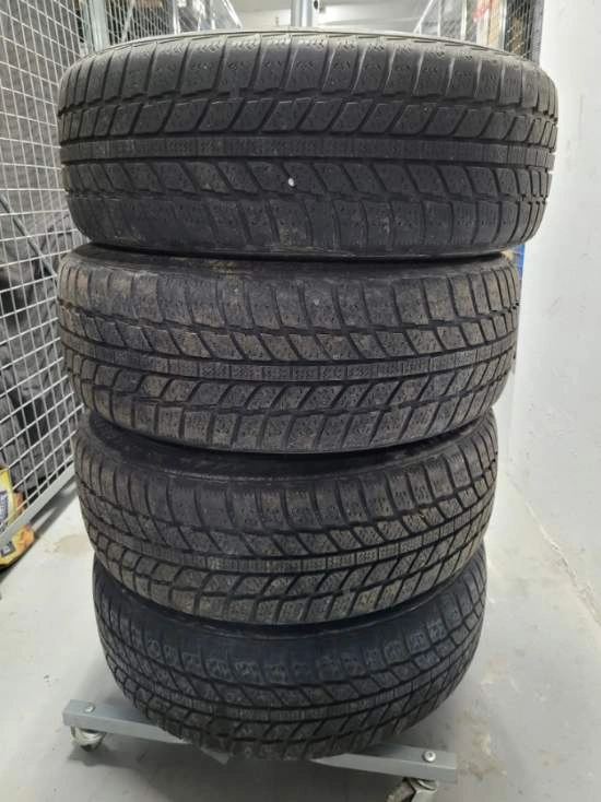 Set of four used Evergreen Winter snow tires with factory rims 4x100 Bolt Pattern and with nut covers. Have been used for 2 winter seasons 80% tred. Mounted on 16 inches rims 195 55 R16 .