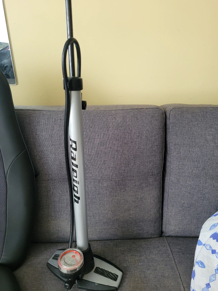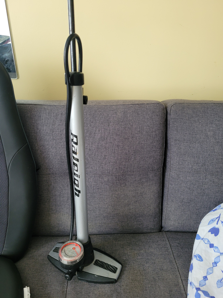 great Raleigh bicycle pump. haven't owned a bike for several years, but my neighbor says it works great. measures the pressure. easy to use. first $15 gets a $50 bike pump. please text me with the time you want to pick it up. Available all day today only.