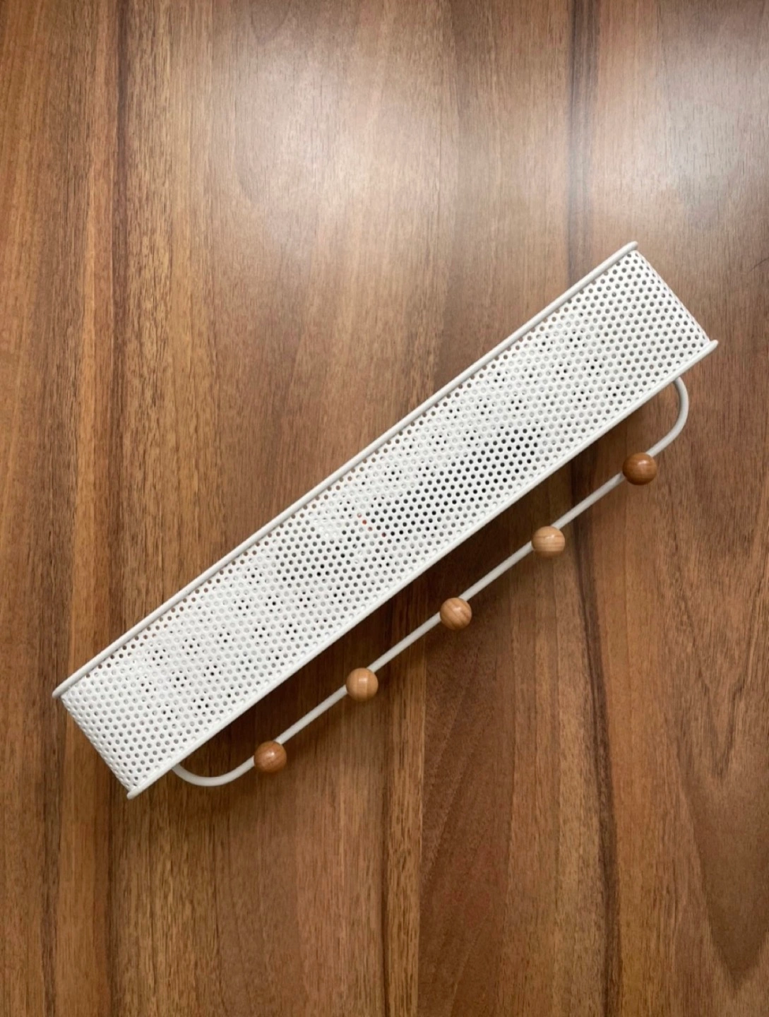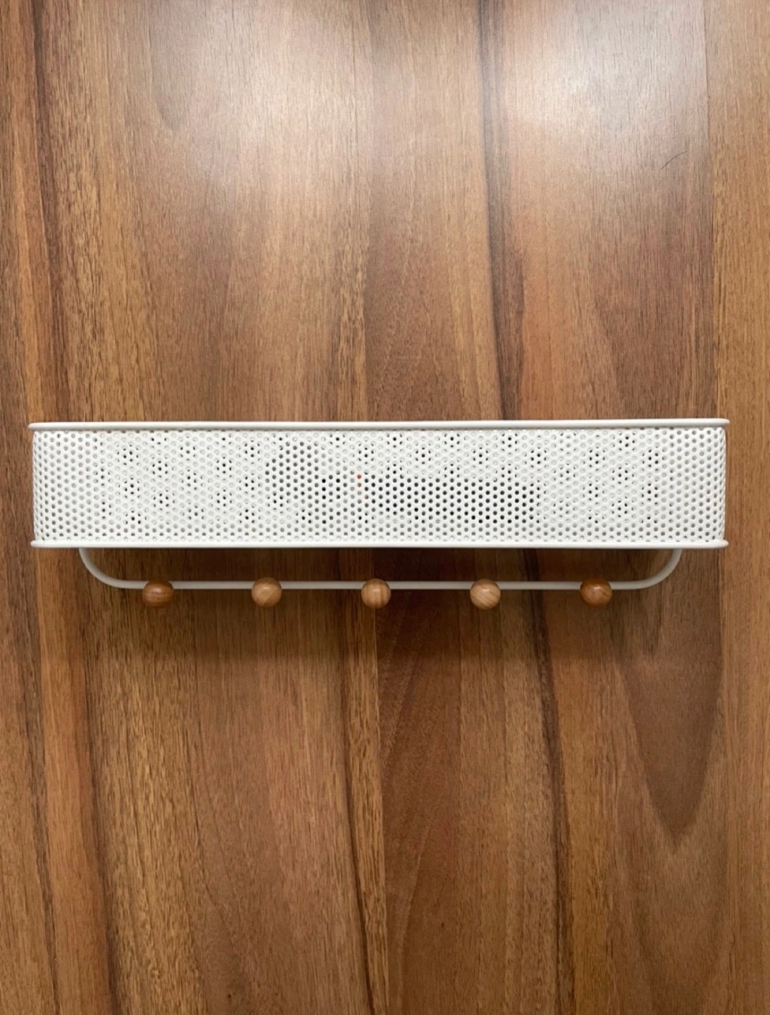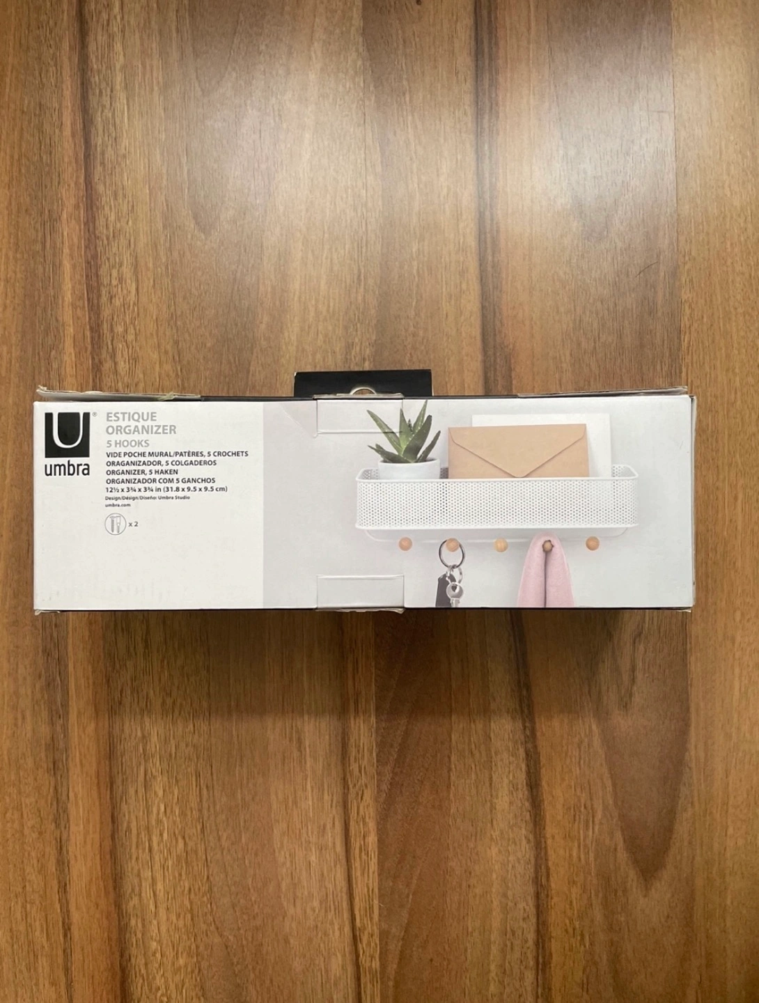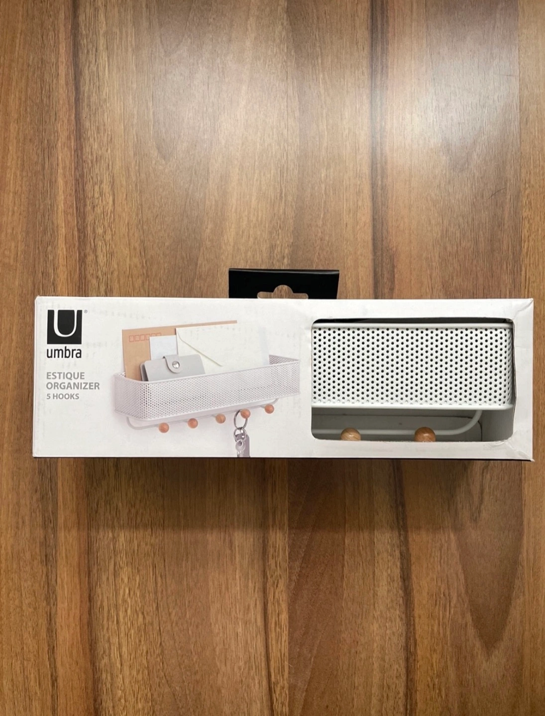 Never used Umbra wall-mounted organizer comes with 5 hooks with wooden knobs which are perfect for hanging your keys, lanyards, dog leashes, as well as scarfs, hats and outerwear.