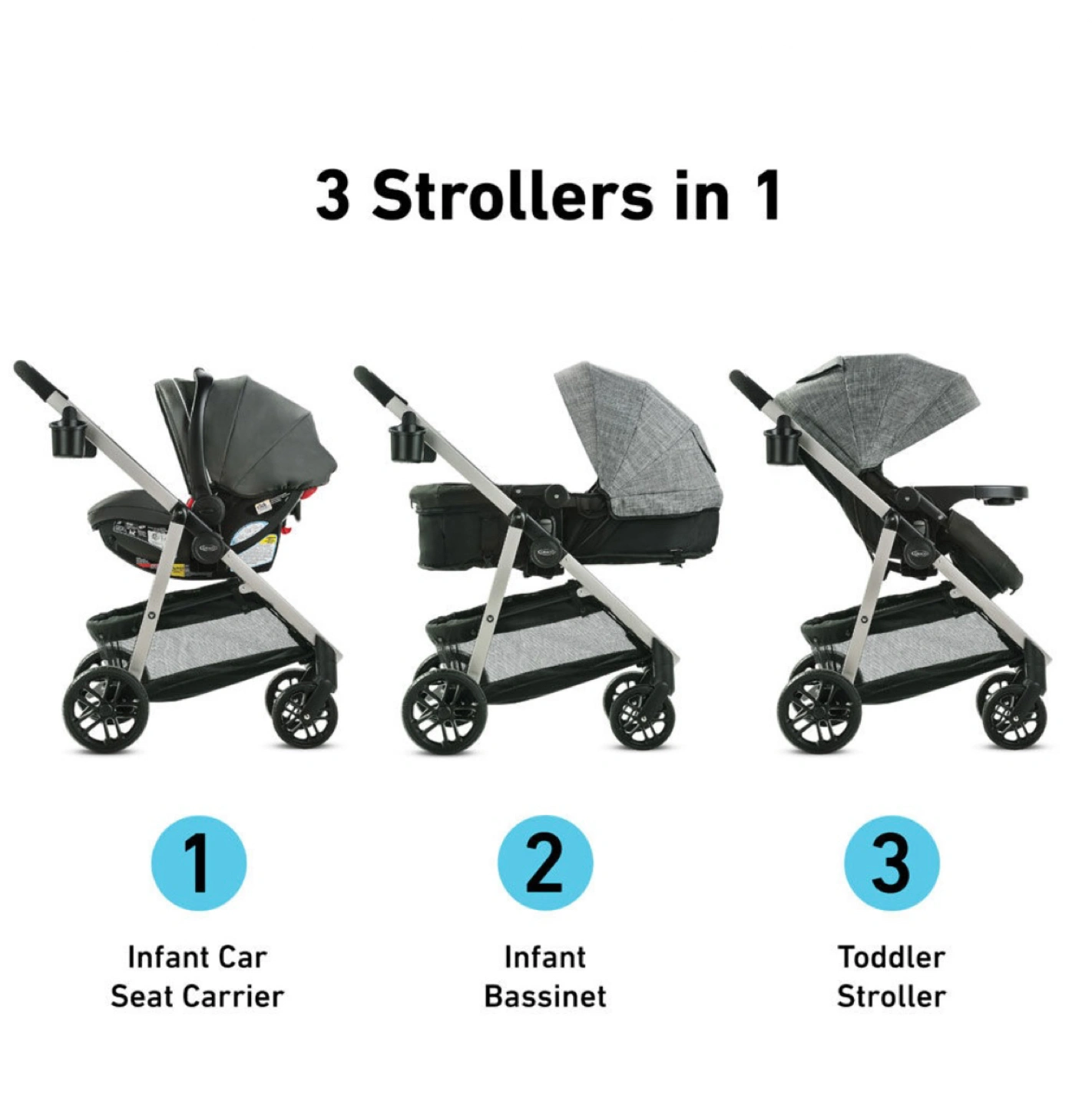 3 strollers in 1: Infant Car Seat Carrier, Infant Stroller, and Toddler Stroller to stroll from infant to toddler