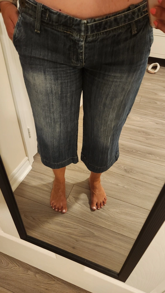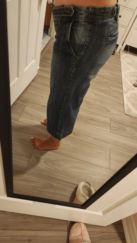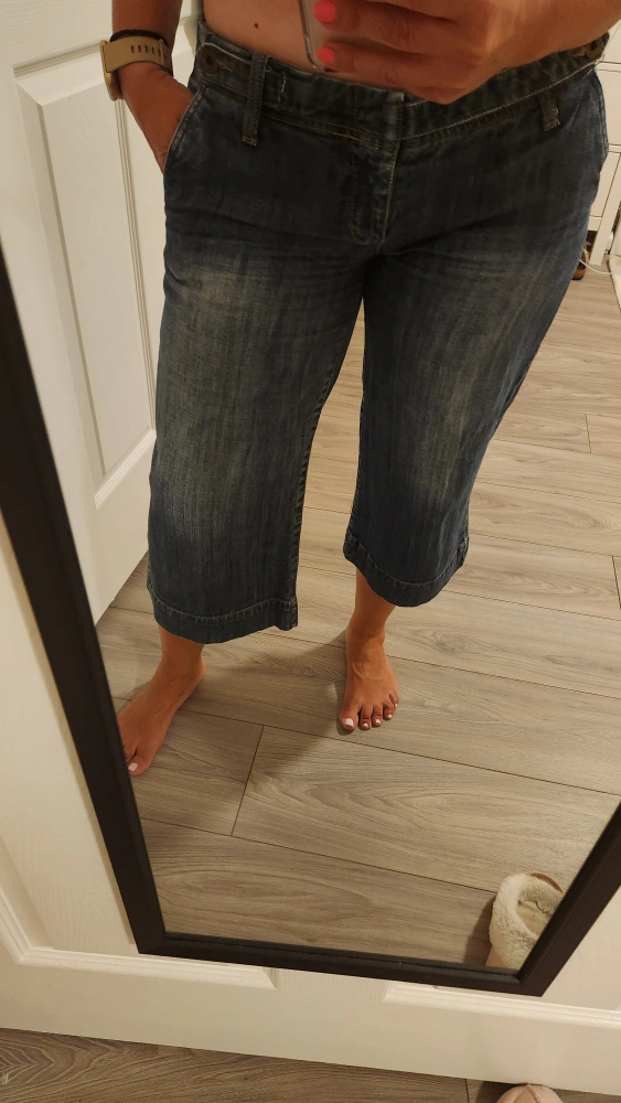 Size 31, wide leg, dark denim, super low rise 3/4 pant. Has button and clasp closure with zipper. Side front pockets with 2 invisible back pockets.