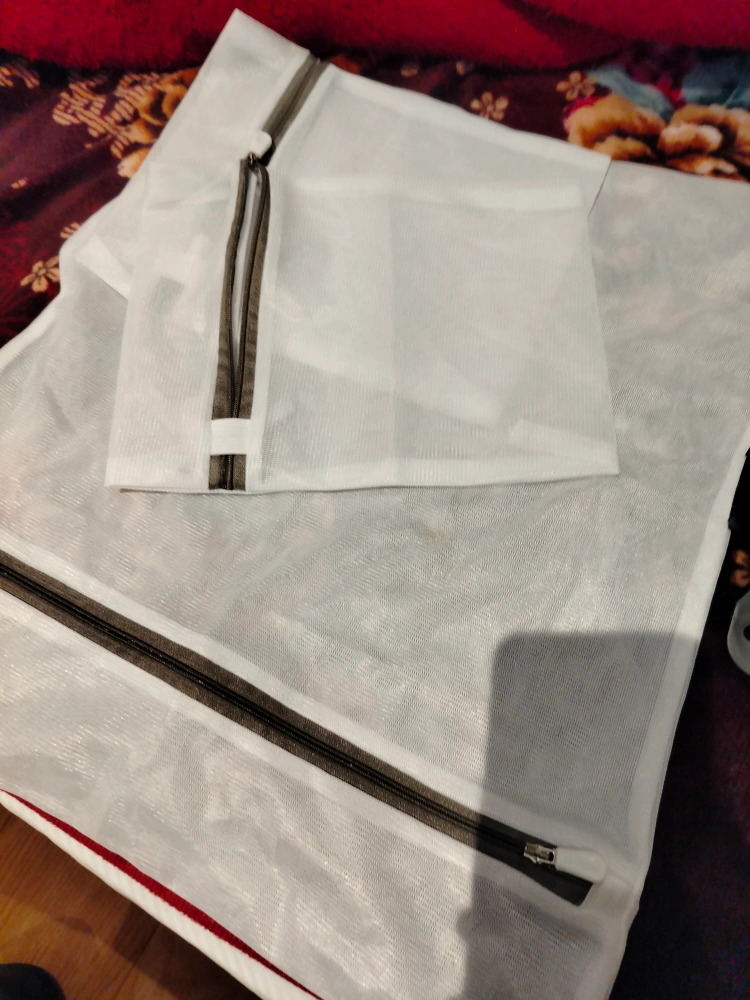 Big white laundry bag: Perfect for ideal loads, with zipper. smaller one for undergarments.
