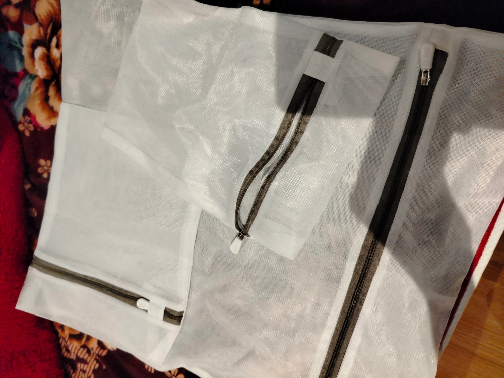 "Small white laundry bag: Ideal for light loads, with zipper closure.