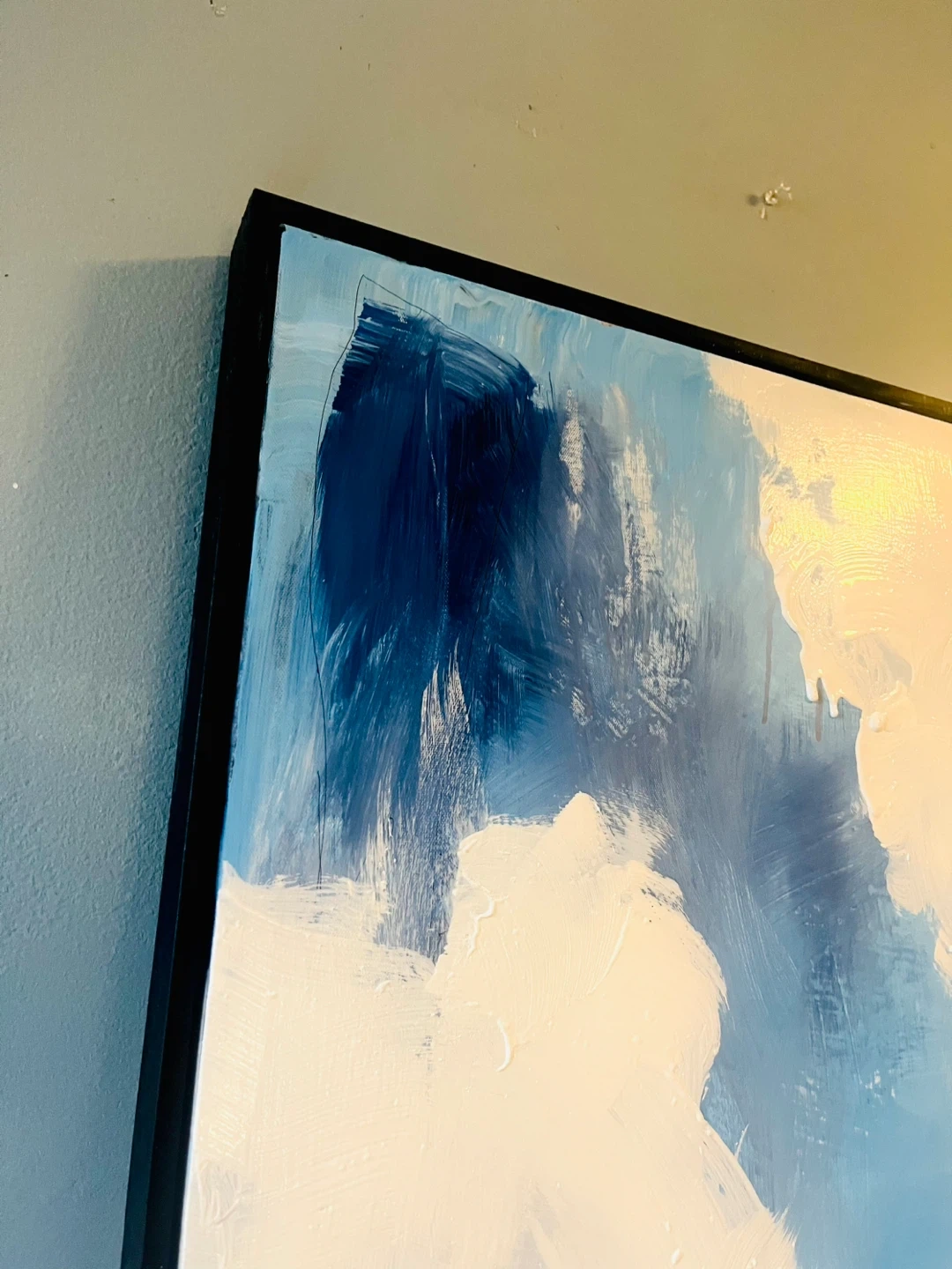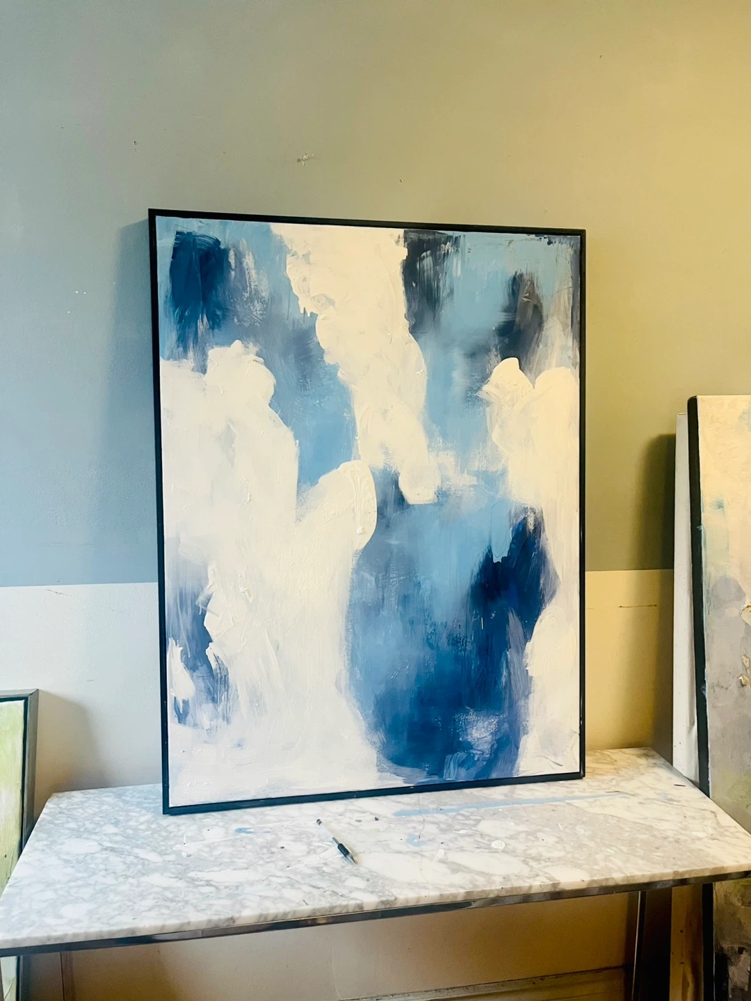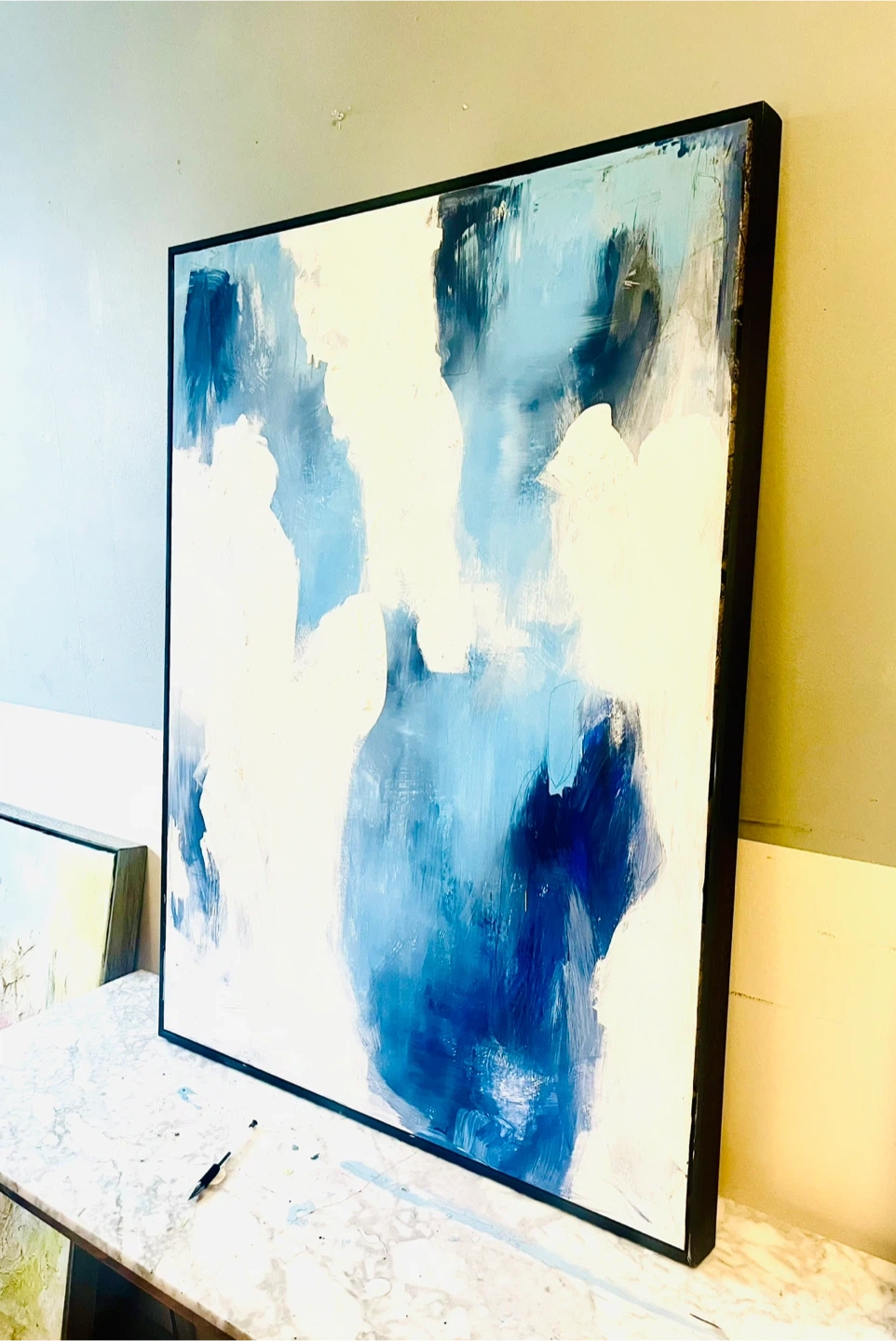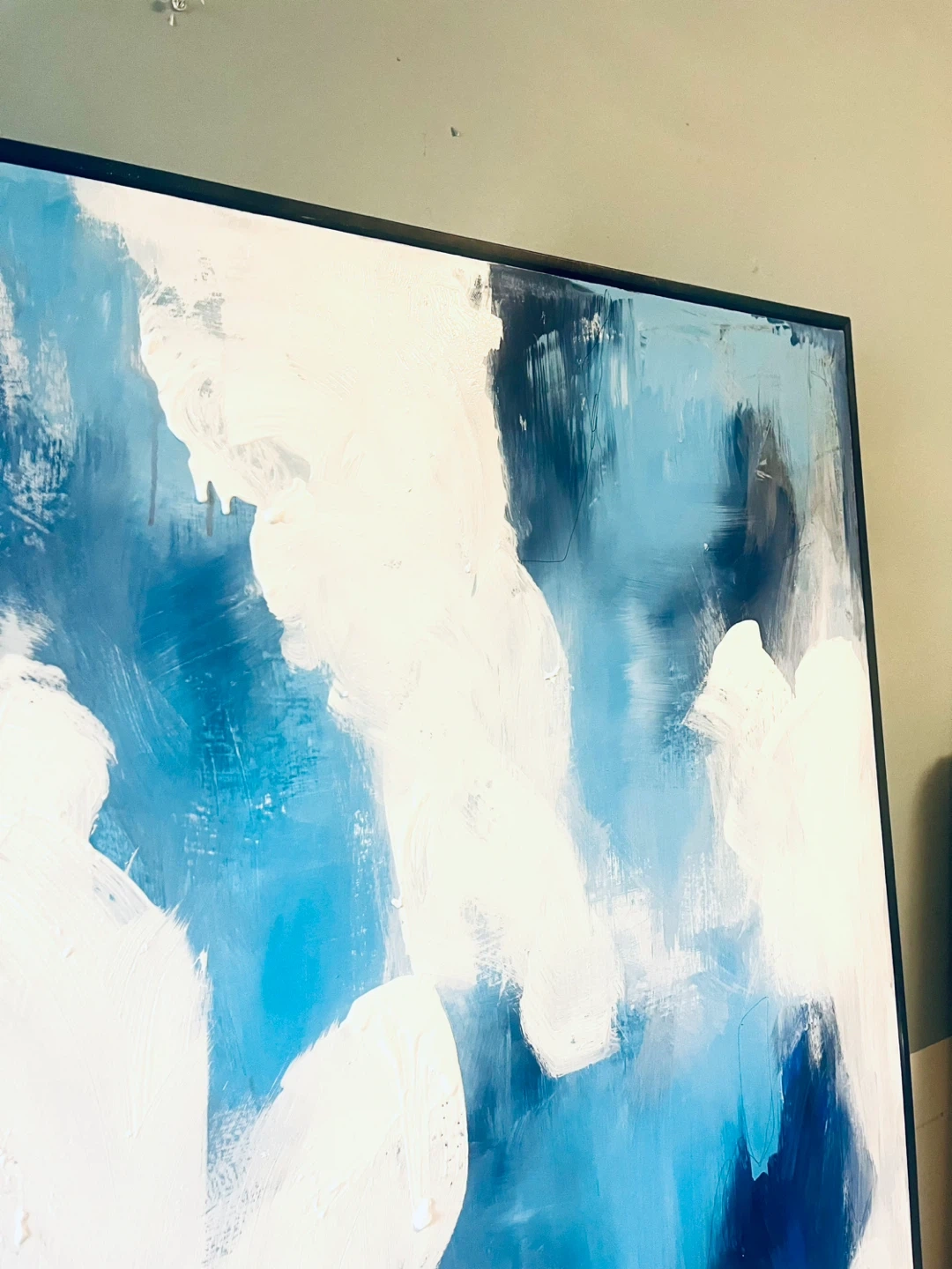 Beautiful original abstract painting featuring shades of blue and white. It's framed in a black modern frame, ready to hang. This piece adds a modern touch to any room!