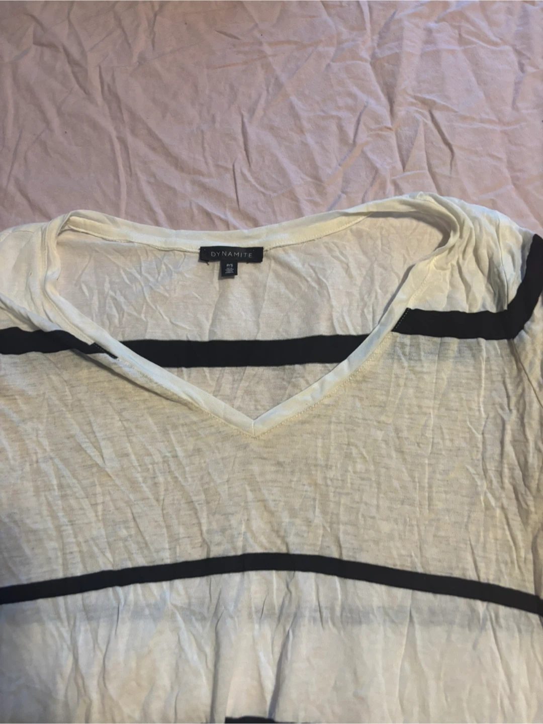Selling a cute Dynamite T-shirt with black stripes! It's a size small and in great condition. Perfect for a casual look!