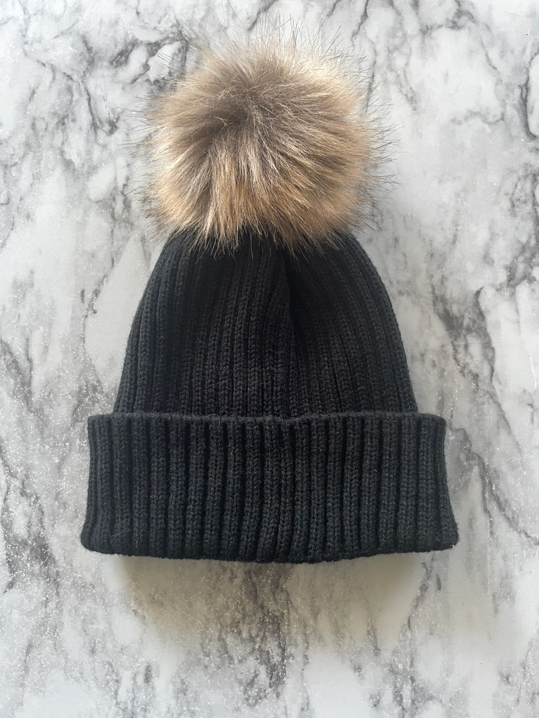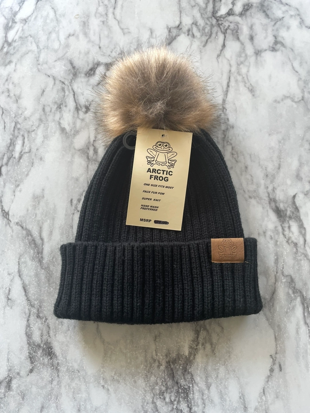 Never used, received as present. Arctic frog black knit toque / hat with faux fur Pom Pom.
