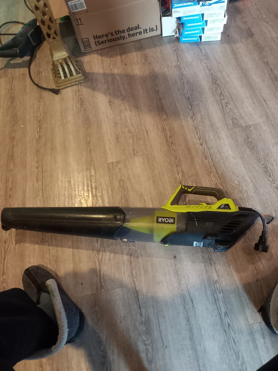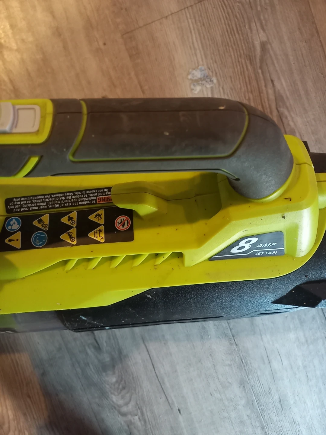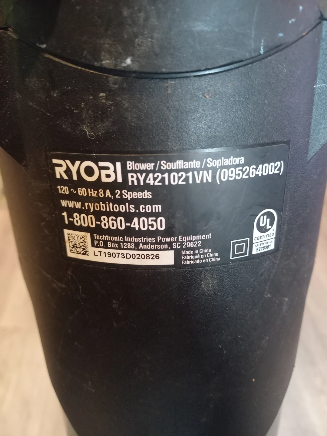 This is a Ryobi RY421021VN electric leaf blower. It operates at 120V ~ 60Hz, 8A and has 2 speeds. It's a corded electric blower for outdoor use. This tool is handy for clearing leaves and debris from your yard. Asking 40 works great but got new outdoor tools set