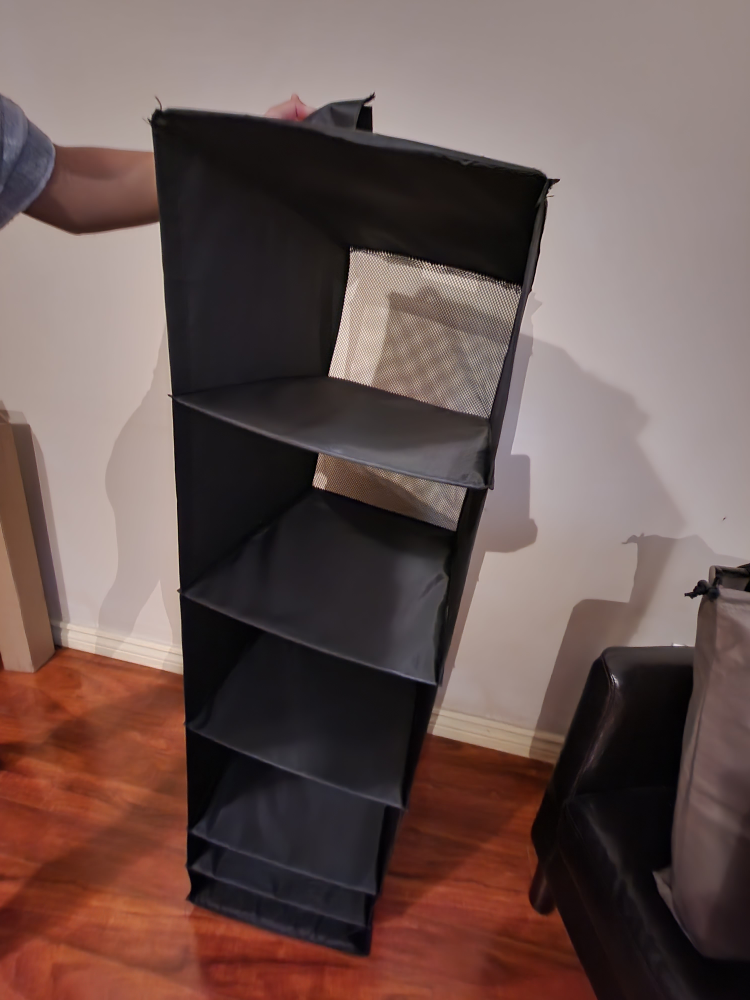 Sturdy, 6 compartments, with straps for hanging, and mesh at the back