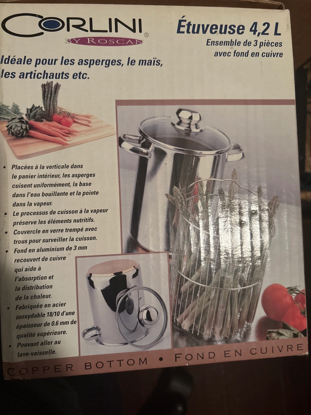 Corlini 3 piece steamer set with a 4.2L capacity and copper bottom. Made of high quality 18/10 stainless steel. This set is ideal for steaming asparagus, corn, and artichokes.
