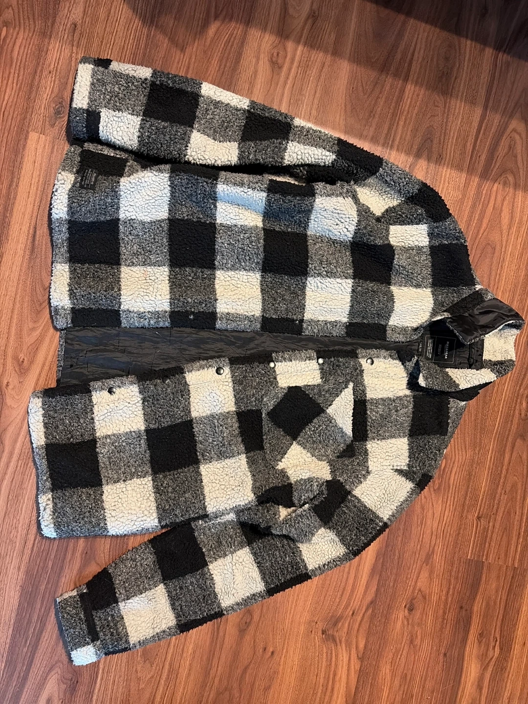 Cozy sherpa jacket with a classic black and white buffalo plaid pattern. It's super soft and warm for chilly days. Snap button closure for a secure fit.