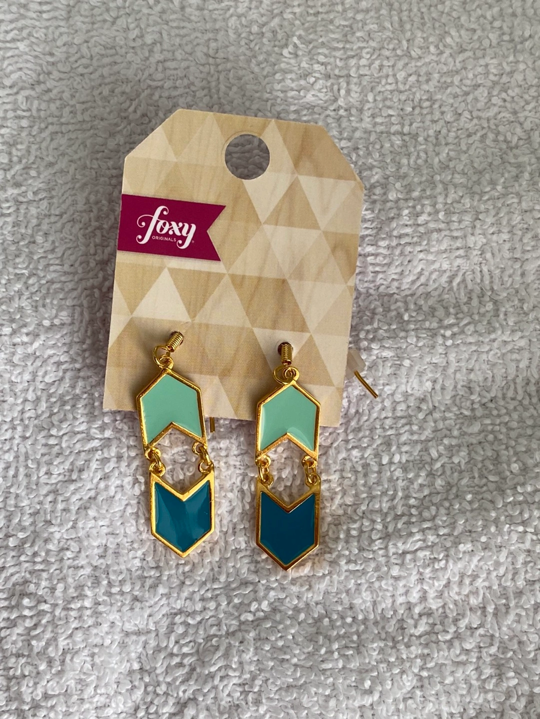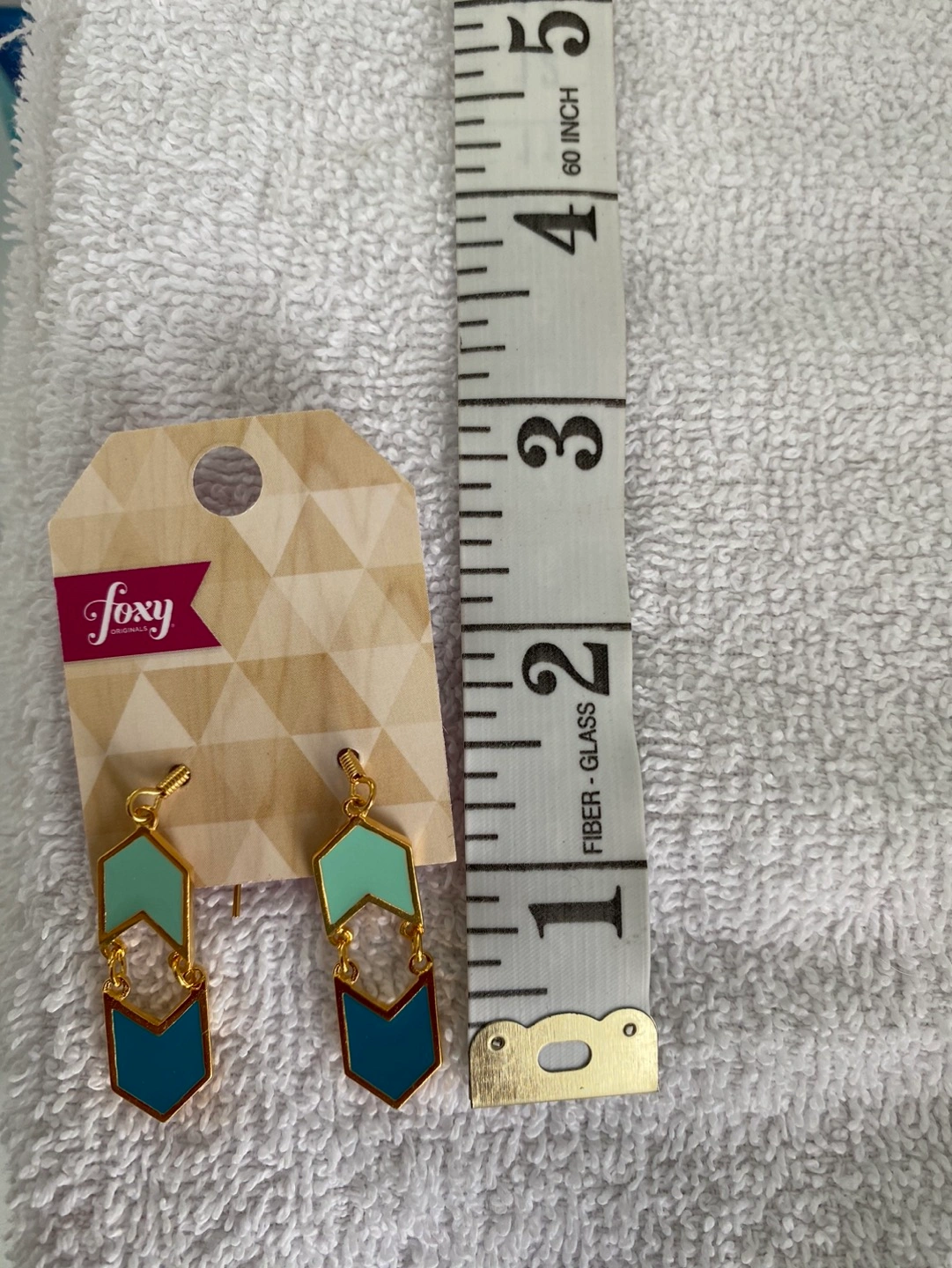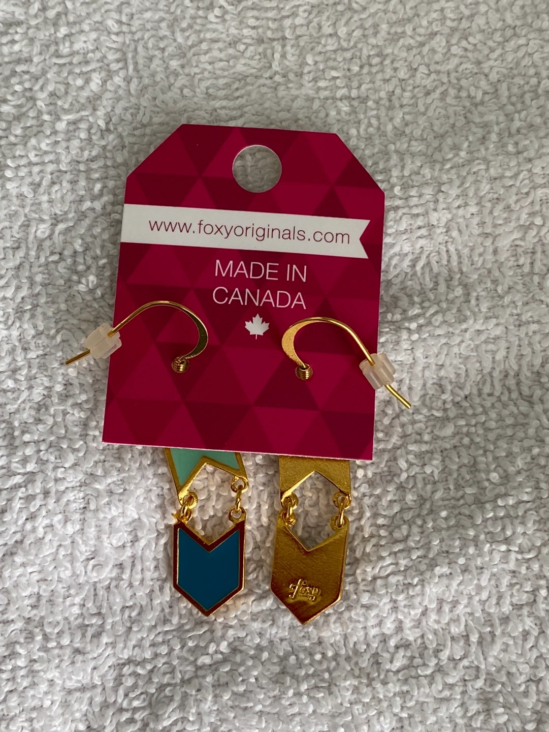 New & unworn gold tone, turquoise & teal dangling earrings from Toronto brand Foxy Originals.