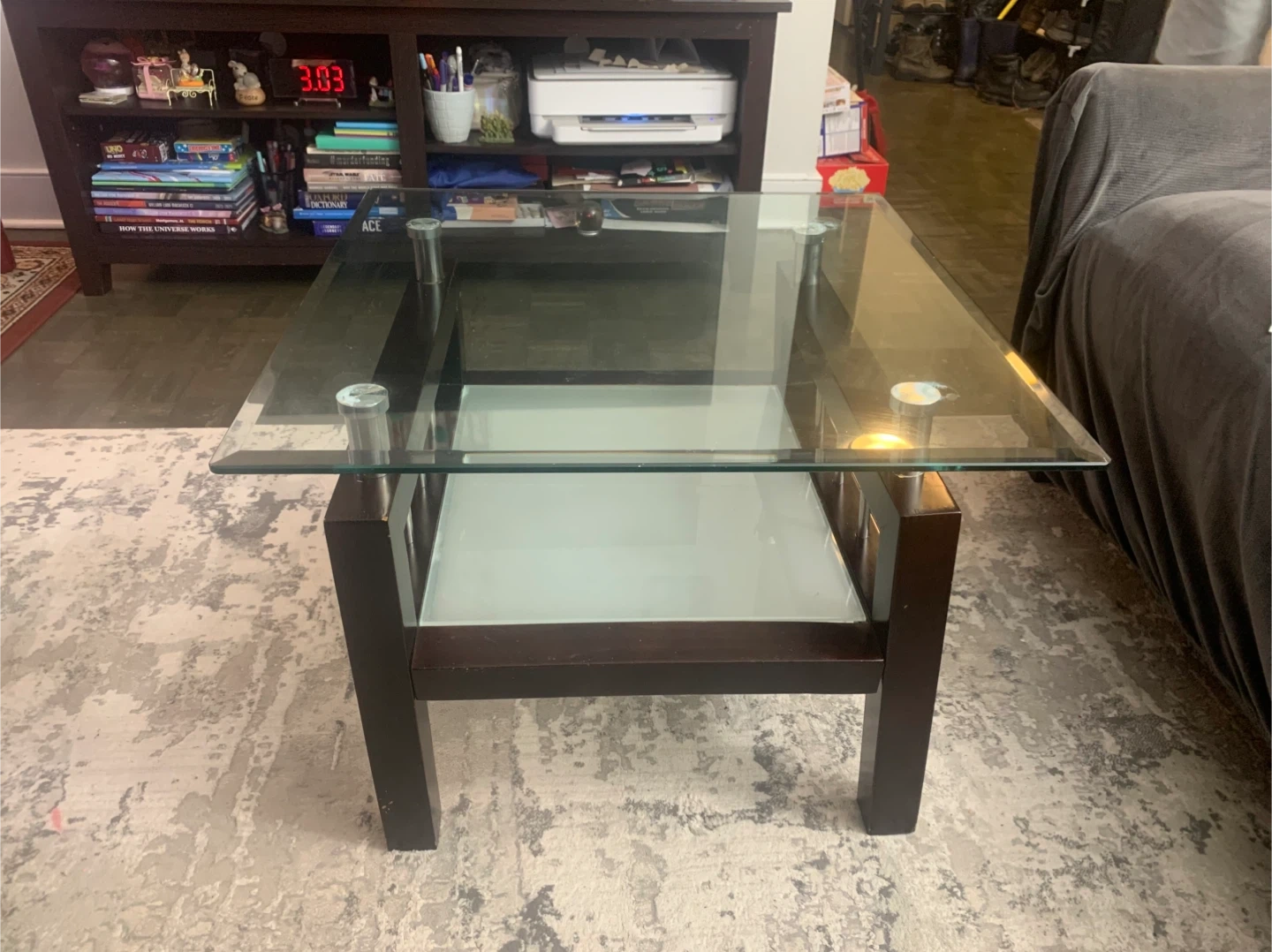 Selling a glass top coffee table. It has a dark brown wooden frame and a clear glass top. The table is in good condition and would be a great addition to any living room.