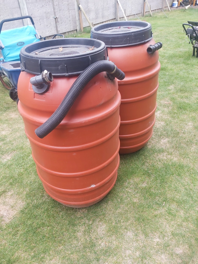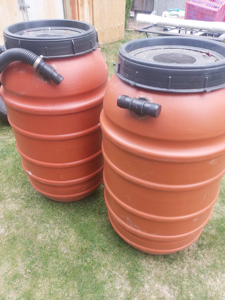 Selling a pair of orange plastic rain barrels. They are in good condition and ready to collect rainwater for your garden or other outdoor needs! They each have a black top with a mesh screen cover and a hose connection. These barrels are durable and perfect for eco-friendly water conservation