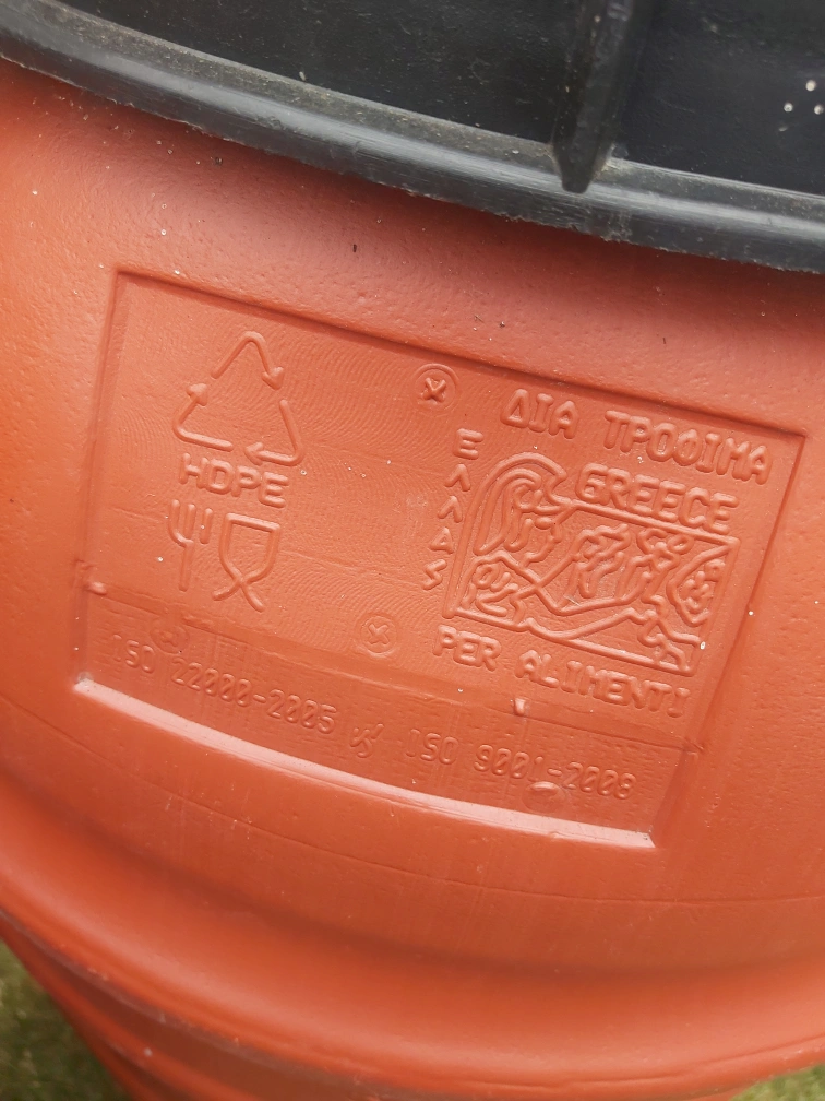 Two Orange Plastic Rain Barrels